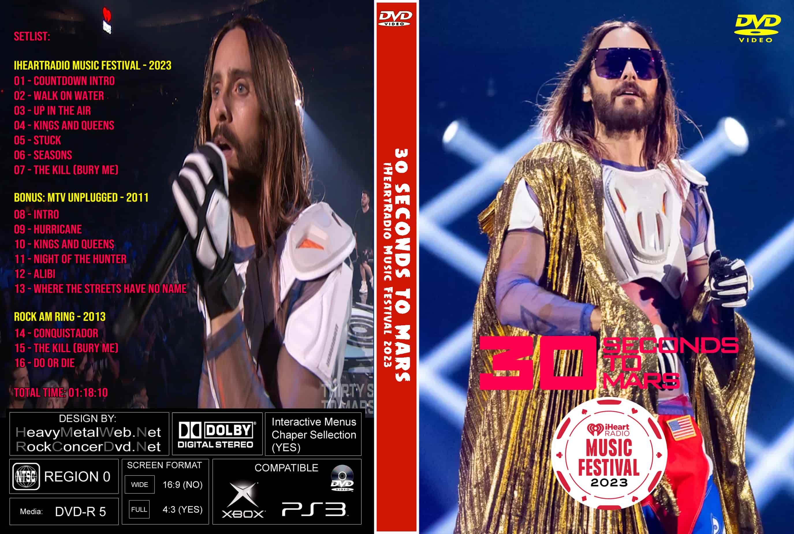 | 30 SECONDS TO MARS iHeartRadio Music Festival, Live at T-Mobile Arena, Las Vegas, NV 2023 DVD DVD Format: NTSC Source: Professional Shot (Multi- Camera) Video Quality: Rating: 9.0 Menus: Yes Chapter Selection: Yes WideScreen: Yes HD: Yes Total Running Time: 78 Min. SETLIST: iHeartRadio Music Festival - 2023 01 - Countdown Intro 02 - Walk on Water 03 - Up in the Air 04 - Kings and Queens 05 - Stuck 06 - Seasons 07 - The Kill (Bury Me) Bonus: MTV Unplugged - 2011 08 - Intro 09 - Hurricane 10 - Kings and Queens 11 - Night of the Hunter 12 - Alibi 13 - Where the Streets Have No Name Rock am Ring - 2013 14 - Conquistador 15 - The Kill (Bury Me) 16 - Do or Die |