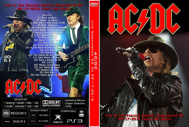 | AC/DC Live at The Verizon Center, Washington DC on 09-17-2016 (feat. Axl Rose) DVD DVD Format: NTSC Source: Audience Shot (Sigle Camera) Video Quality: Rating: 8.5 Menus: No Chapter Selection: Every 5 Min Widescreen: Yes HD: Yes Total Running Time: 139 Min. SETLIST: 1) Rock or Bust 2) Shoot to Thrill 3) Hell Ain't a Bad Place to Be 4) Back in Black 5) Got Some Rock & Roll Thunder 6) Dirty Deeds Done Dirt Cheap 7) Rock 'n' Roll Damnation 8) Thunderstruck 9) High Voltage 10) Rock 'n' Roll Train 11) Hells Bells 12) Given the Dog a Bone 13) If You Want Blood (You've Got It) 14) Live Wire 15) Sin City 16) You Shook Me All Night Long 17) Shot Down in Flames 18) Have a Drink on Me 19) T.N.T. 20) Whole Lotta Rosie 21) Let There Be Rock - (Includes Angus Young Guitar Solo) 22) Highway to Hell 23) Riff Raff 24) For Those About to Rock (We Salute You) |