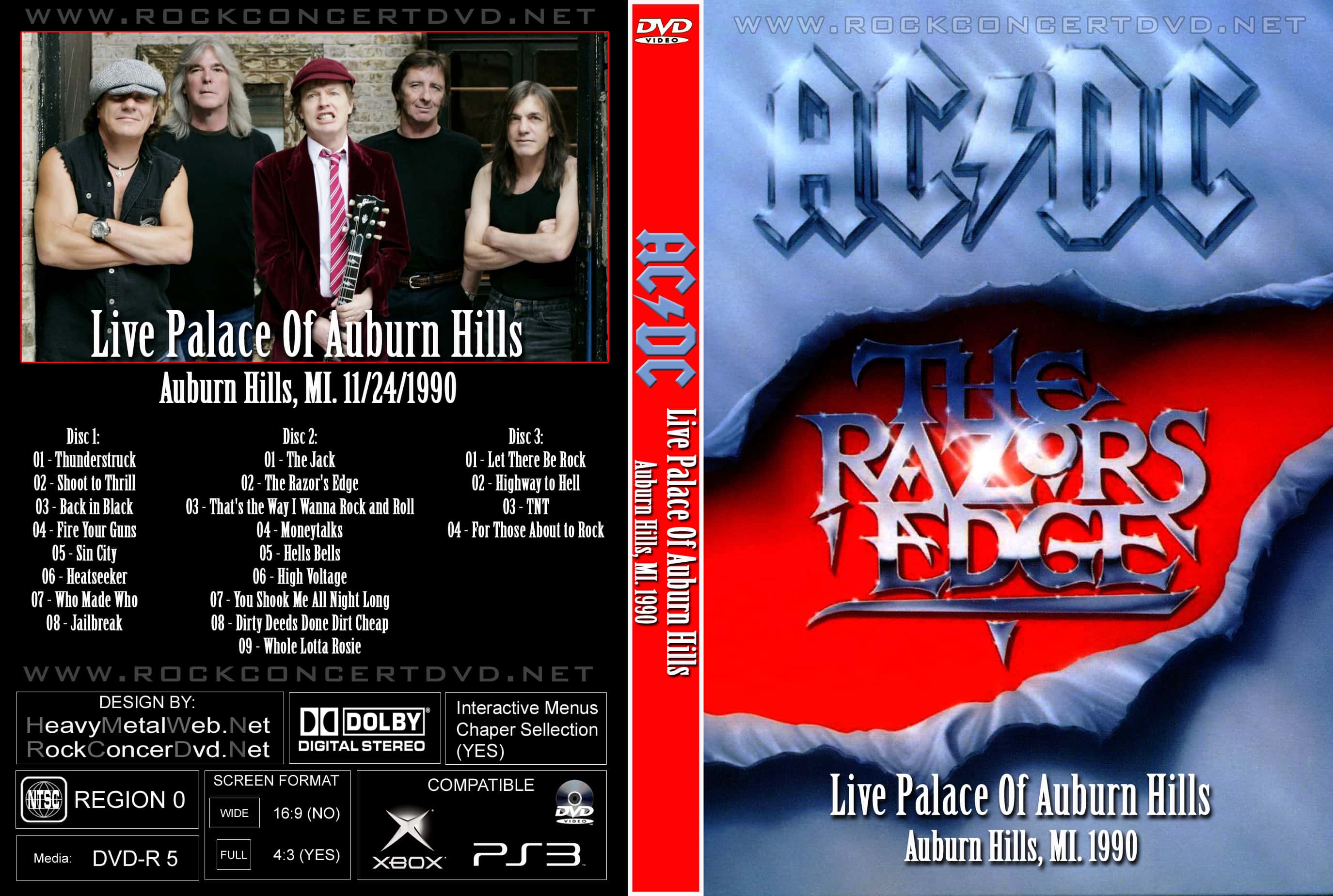 | AC/DC Live Palace Of Auburn Hills, Auburn Hills, MI. 11/24/1990 (3 DVDs) DVD Format: NTSC Source: Pro-Shot (Multi Camera) Video Quality: Rating: 7.5 Menus: Yes Chapter Selection: Yes Full Screen: Yes Total Running Time: 130 Min. SET LIST: Disc 1: 01 - Thunderstruck 02 - Shoot to Thrill 03 - Back in Black 04 - Fire Your Guns 05 - Sin City 06 - Heatseeker 07 - Who Made Who 08 - Jailbreak Disc 2: 01 - The Jack 02 - The Razor's Edge 03 - That's the Way I Wanna Rock and Roll 04 - Moneytalks 05 - Hells Bells 06 - High Voltage 07 - You Shook Me All Night Long 08 - Dirty Deeds Done Dirt Cheap 09 - Whole Lotta Rosie Disc 3: 01 - Let There Be Rock 02 - Highway to Hell 03 - TNT 04 - For Those About to Rock |