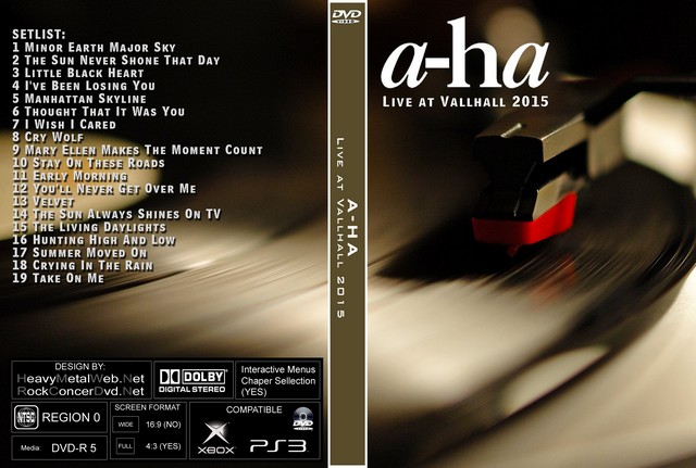 | A-HA Live at Vallhall 2015 DVD DVD Format: NTSC Source: Pro-Shot (Multi Camera) Video Quality: Rating: 8.5 Menus: No Chapter Selection: Every 5 Min. Widescreen: Yes HD: Yes Total Running Time: 101 Min. SETLIST: 1 Minor Earth Major Sky 2 The Sun Never Shone That Day 3 Little Black Heart 4 I've Been Losing You 5 Manhattan Skyline 6 Thought That It Was You 7 I Wish I Cared 8 Cry Wolf 9 Mary Ellen Makes The Moment Count 10 Stay On These Roads 11 Early Morning 12 You'll Never Get Over Me 13 Velvet 14 The Sun Always Shines On TV 15 The Living Daylights 16 Hunting High And Low 17 Summer Moved On 18 Crying In The Rain 19 Take On Me |