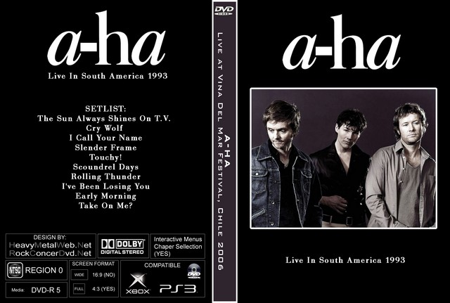 | A-HA Live In South America 1993 DVD DVD Format: NTSC Source: Pro-Shot (Multi Camera) Video Quality: Rating: 8.0 Menus: No Chapter Selection: Every 5 Min. Widescreen: Yes HD: Yes Total Running Time: 57 Min. SETLIST: The Sun Always Shines On T.V. Cry Wolf I Call Your Name Slender Frame Touchy! Scoundrel Days Rolling Thunder I've Been Losing You Early Morning Take On Me? |