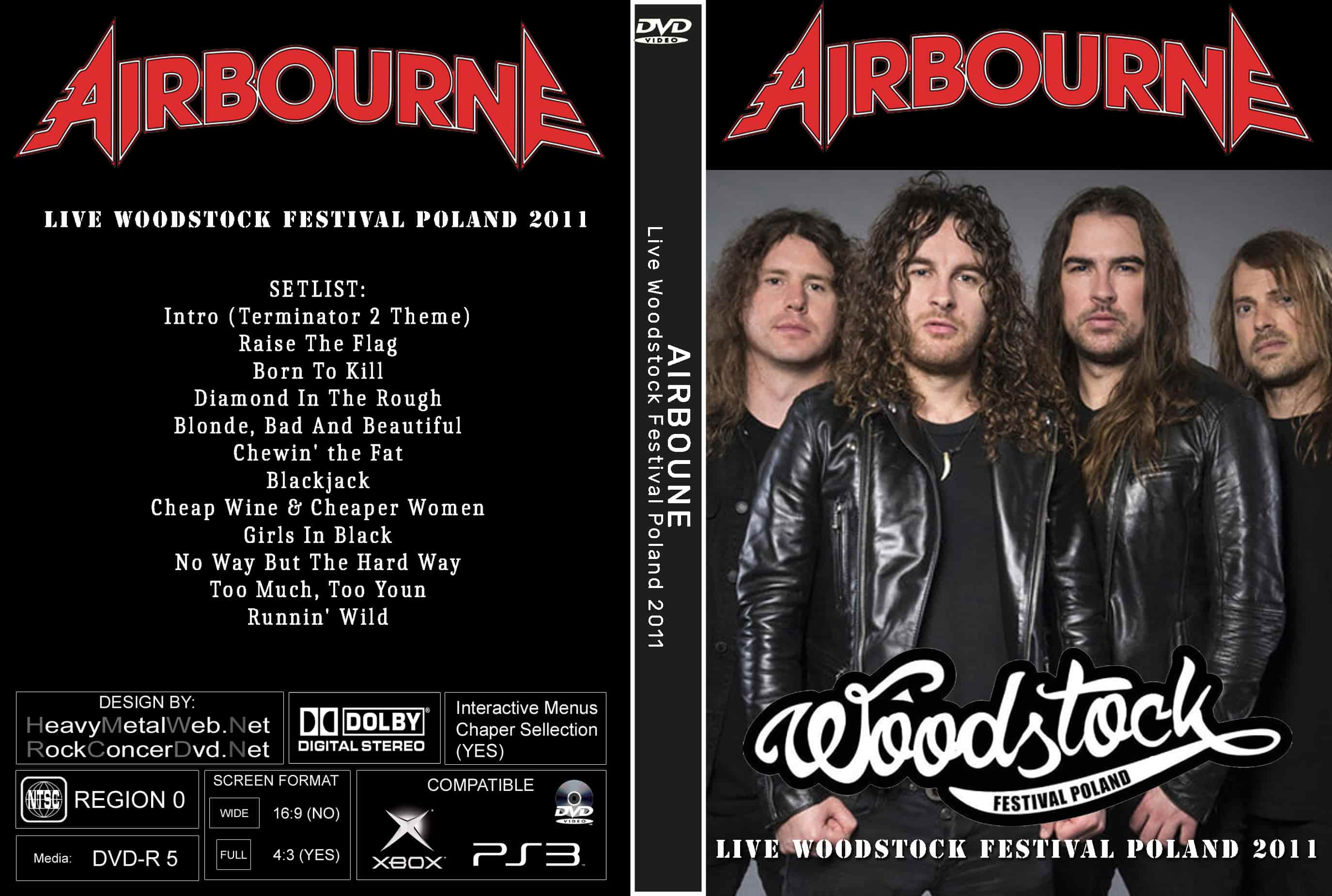| AIRBOURNE Live Woodstock Festival Poland 2011 DVD DVD Format: NTSC Source: Professional Shot (Multi Camera) Video Quality: Rating: 9.0 Menus: No Chapter Selection: Every 5 Min Widescreen: Yes HD: Yes Total Running Time: 69 Min. SETLIST: Intro (Terminator 2 Theme) Raise The Flag Born To Kill Diamond In The Rough Blonde, Bad And Beautiful Chewin' the Fat Blackjack Cheap Wine & Cheaper Women Girls In Black No Way But The Hard Way Too Much, Too Youn Runnin' Wild |
