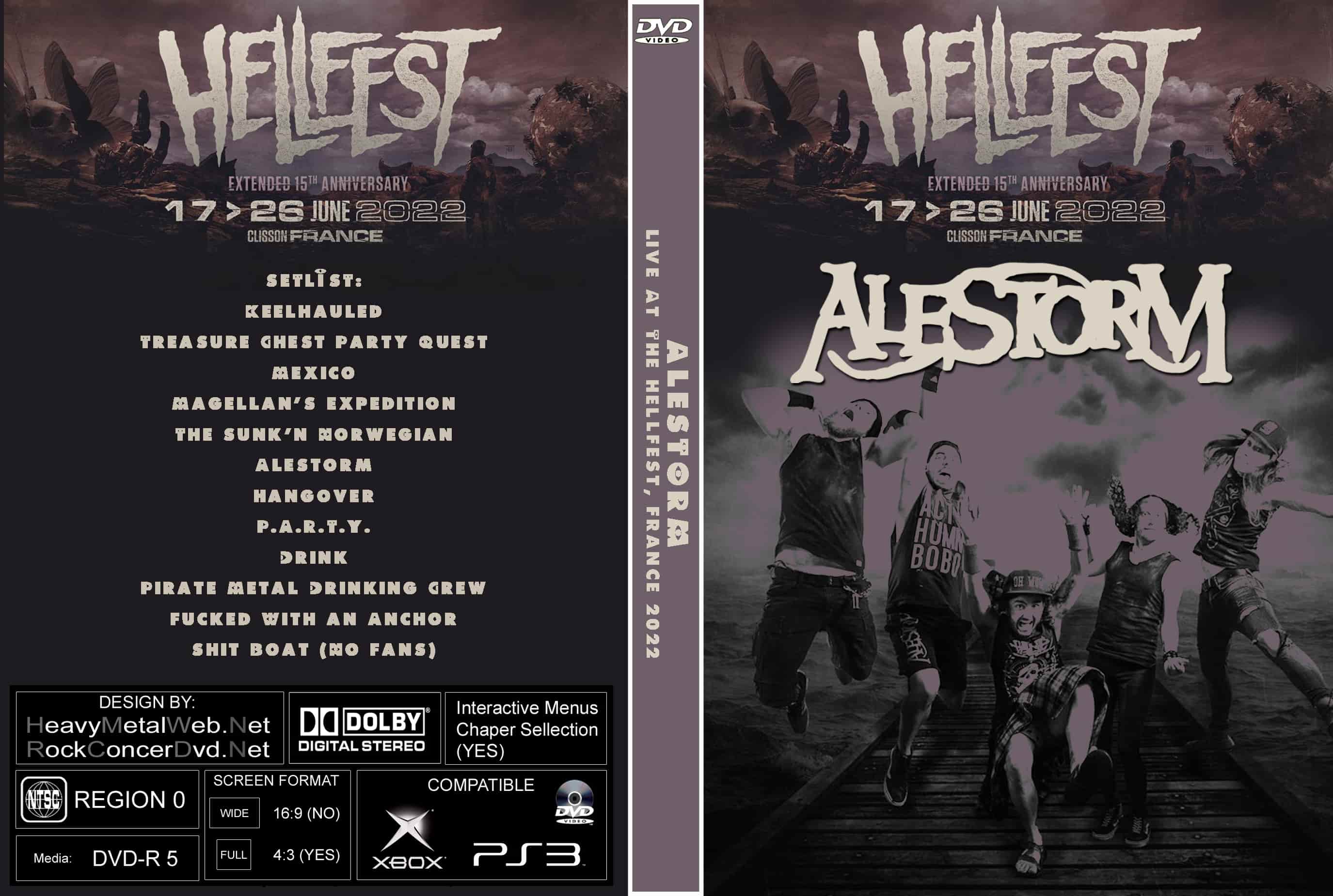 | ALESTORM Live At The Hellfest, France 2022 DVD DVD Format: NTSC Source: Professional Shot (Multi Camera) Video Quality: Rating: 9.0 Menus: No Chapter Selection: Every 5 Min Widescreen: Yes HD: Yes Total Running Time: 50 Min. SETLIST: Keelhauled Treasure Chest Party Quest Mexico Magellan's Expedition The Sunk'n Norwegian Alestorm Hangover P.A.R.T.Y. Drink Pirate Metal Drinking Crew Fucked With an Anchor Shit Boat (No Fans) |