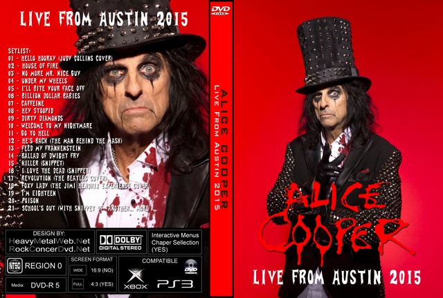 | ALICE COOPER Live From Austin 2015 DVD DVD Format: NTSC Source: Pro-Shot (Multi Camera) Video Quality: Rating: 9.0 Menus: No Chapter Selection: Every 5 Min Widescreen: Yes HD: Yes Total Running Time: 92 Min. SETLIST: 01 - Hello Hooray (Judy Collins cover) 02 - House of Fire 03 - No More Mr. Nice Guy 04 - Under My Wheels 05 - I'll Bite Your Face Off 06 - Billion Dollar Babies 07 - Caffeine 08 - Hey Stoopid 09 - Dirty Diamonds 10 - Welcome to My Nightmare 11 - Go to Hell 12 - He's Back (The Man Behind the Mask) 13 - Feed My Frankenstein 14 - Ballad of Dwight Fry 15 - Killer (snippet) 16 - I Love the Dead (snippet) 17 - Revolution (The Beatles cover) 18 - Foxy Lady (The Jimi Hendrix Experience cover) 19 - I'm Eighteen 20 - Poison 21 - School's Out (with snippet of "Another… more ) |