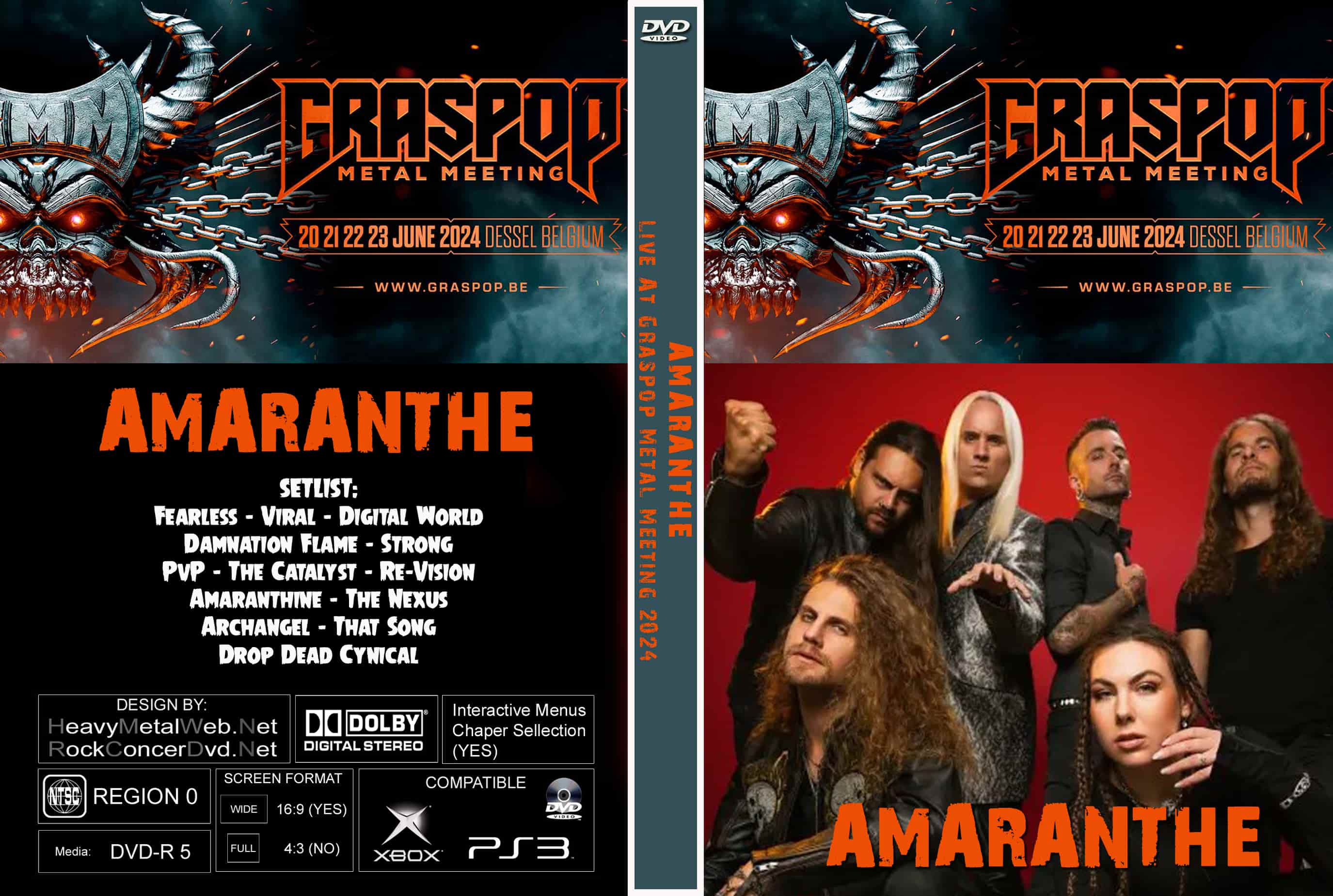 | AMARANTHE Live At Grasspop Metal Meeting 2024 DVD DVD Format: NTSC Source: Professional Shot (Multi- Camera) Video Quality: Rating: 8.5 Menus: Yes Chapter Selection: Every 5 Min. WideScreen: Yes HD: Yes Total Running Time: 59 Min. SETLIST: Fearless Viral Digital World Damnation Flame Strong PvP The Catalyst Re-Vision Amaranthine The Nexus Archangel That Song Drop Dead Cynical |
