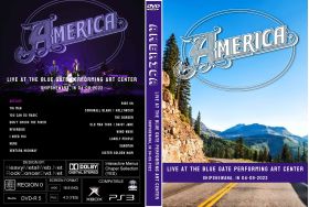 | AMERICA Live At TheBlue Gate Performing Arts Center, Shipshewana, IN 04-09-2022 DVD DVD Format: NTSC Source: Audience Shot (Single Camera) Video Quality: Rating: 9.0 Menus: nO Chapter Selection: Every 5 Min. Widescreen: Yes HD: Yes Total Running Time: 90 Min. SETLIST: Tin Man You Can Do Magic Don't Cross the River Riverside I Need You Here Ventura Highway Ride On Cornwall Blank / Hollywood The Border Old Man Took / Daisy Jane Wind Wave Lonely People Sandman Sister Golden Hair A Horse with No Name |