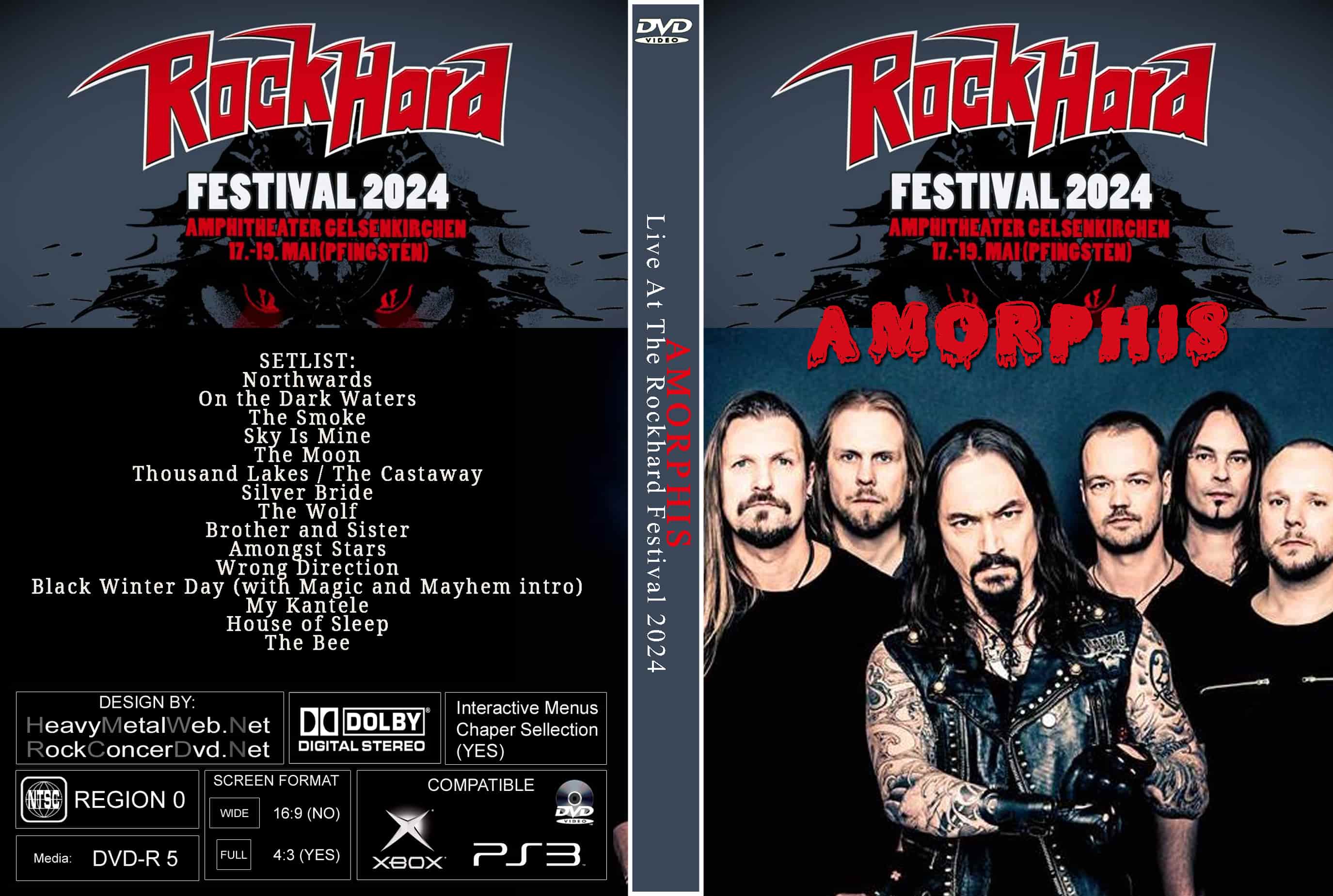 | AMORPHIS Live At The Rock Hard Festival 2024 DVD DVD Format: NTSC Source: Professional Shot (Multi- Camera) Video Quality: Rating: 9.0 Menus: Yes Chapter Selection: Every 5 Min. WideScreen: Yes HD: Yes Total Running Time: 86 Min. SETLIST: Northwards On the Dark Waters The Smoke Sky Is Mine The Moon Thousand Lakes / The Castaway Silver Bride The Wolf Brother and Sister Amongst Stars Wrong Direction Black Winter Day (with Magic and Mayhem intro) My Kantele House of Sleep The Bee |