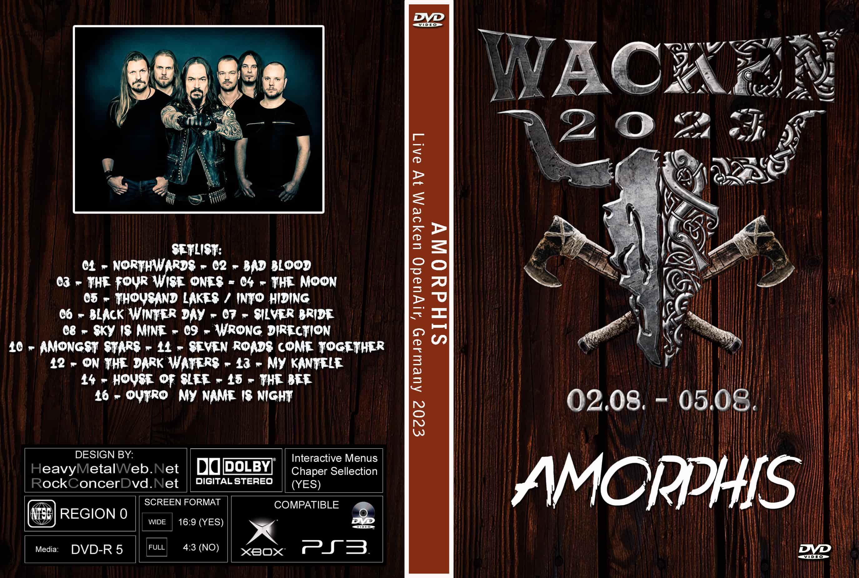| AMORPHIS Live At The Wacken Open Air 2023 DVD DVD Format: NTSC Source: Professional Shot (Multi- Camera) Video Quality: Rating: 9.0 Menus: Yes Chapter Selection: Yes WideScreen: Yes HD: Yes Total Running Time: 85 Min. SETLIST: 01 - Northwards 02 - Bad Blood 03 - The Four Wise Ones 04 - The Moon 05 - Thousand Lakes / Into Hiding 06 - Black Winter Day 07 - Silver Bride 08 - Sky Is Mine 09 - Wrong Direction 10 - Amongst Stars 11 - Seven Roads Come Together 12 - On the Dark Waters 13 - My Kantele 14 - House of Slee 15 - The Bee 16 - Outro (My Name Is Night) |
