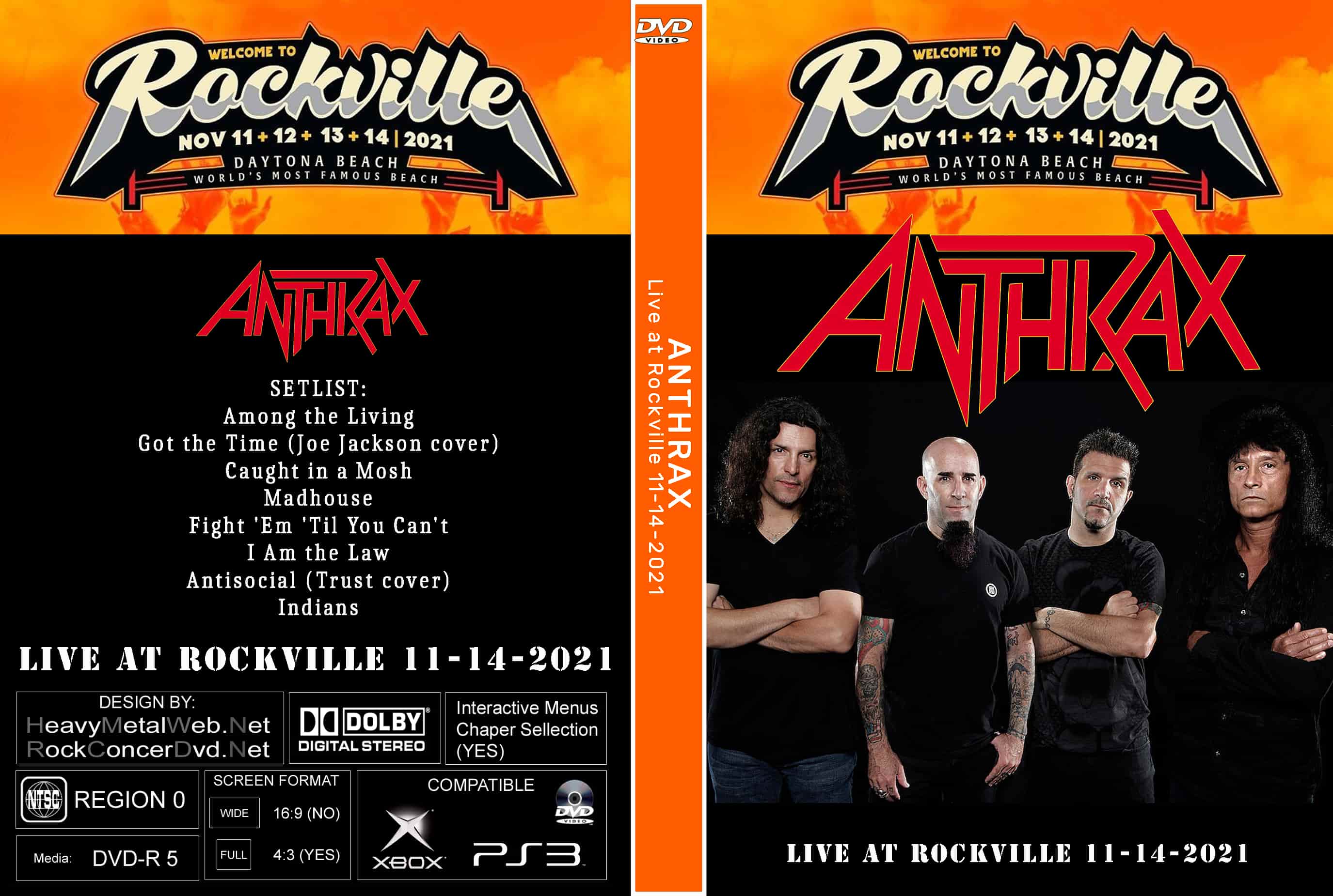 | ANTHRAX Live at Rockville 11-14-2021 DVD DVD Format: NTSC Source: Professional Shot (Multi Camera) Video Quality: Rating: 9.0 Menus: No Chapter Selection: Every 5 Min Widescreen: Yes HD: Yes Total Running Time: 47 Min. SETLIST: Among the Living Got the Time (Joe Jackson cover) Caught in a Mosh Madhouse Fight 'Em 'Til You Can't I Am the Law Antisocial (Trust cover) Indians |