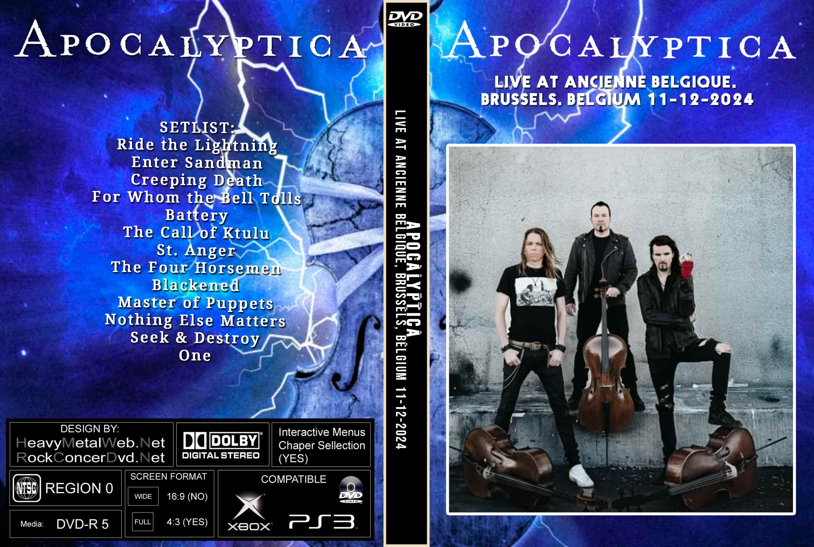 | APOCALYPTICA Live at Ancienne Belgique, Brussels, Belgium 11-12-2024 DVD DVD Format: NTSC Source: Professional Shot (Multi- Camera) Video Quality: Rating: 9.0 Menus: Yes Chapter Selection: Every 5 Min. WideScreen: Yes HD: Yes Total Running Time: 91 Min. SETLIST: Ride the Lightning Enter Sandman Creeping Death For Whom the Bell Tolls Battery The Call of Ktulu St. Anger The Four Horsemen Blackened Master of Puppets Nothing Else Matters Seek & Destroy One |