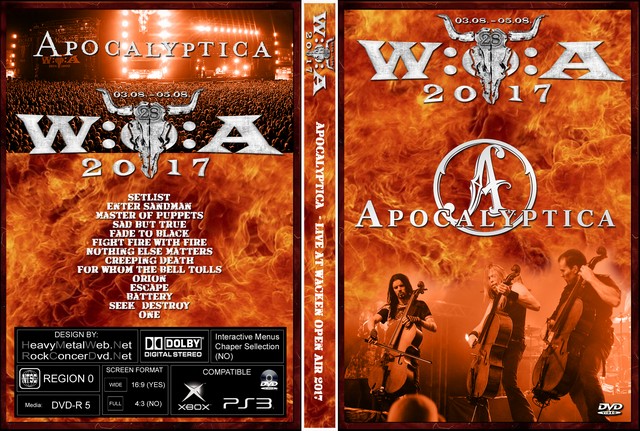 | APOCALYPTICA Live At Wacken Open Air 2017 DVD DVD Format: NTSC Source: Pro-Shot (Multi Camera) Video Quality: Rating: 9.0 Menus: Yes Chapter Selection: Yes Widescreen: Yes HD: Yes Total Running Time: 79 Min. SETLIST: Enter Sandman Master of Puppets Sad but True Fade to Black Fight Fire With Fire Nothing Else Matters Creeping Death For Whom the Bell Tolls Orion Escape Battery Seek & Destroy One |