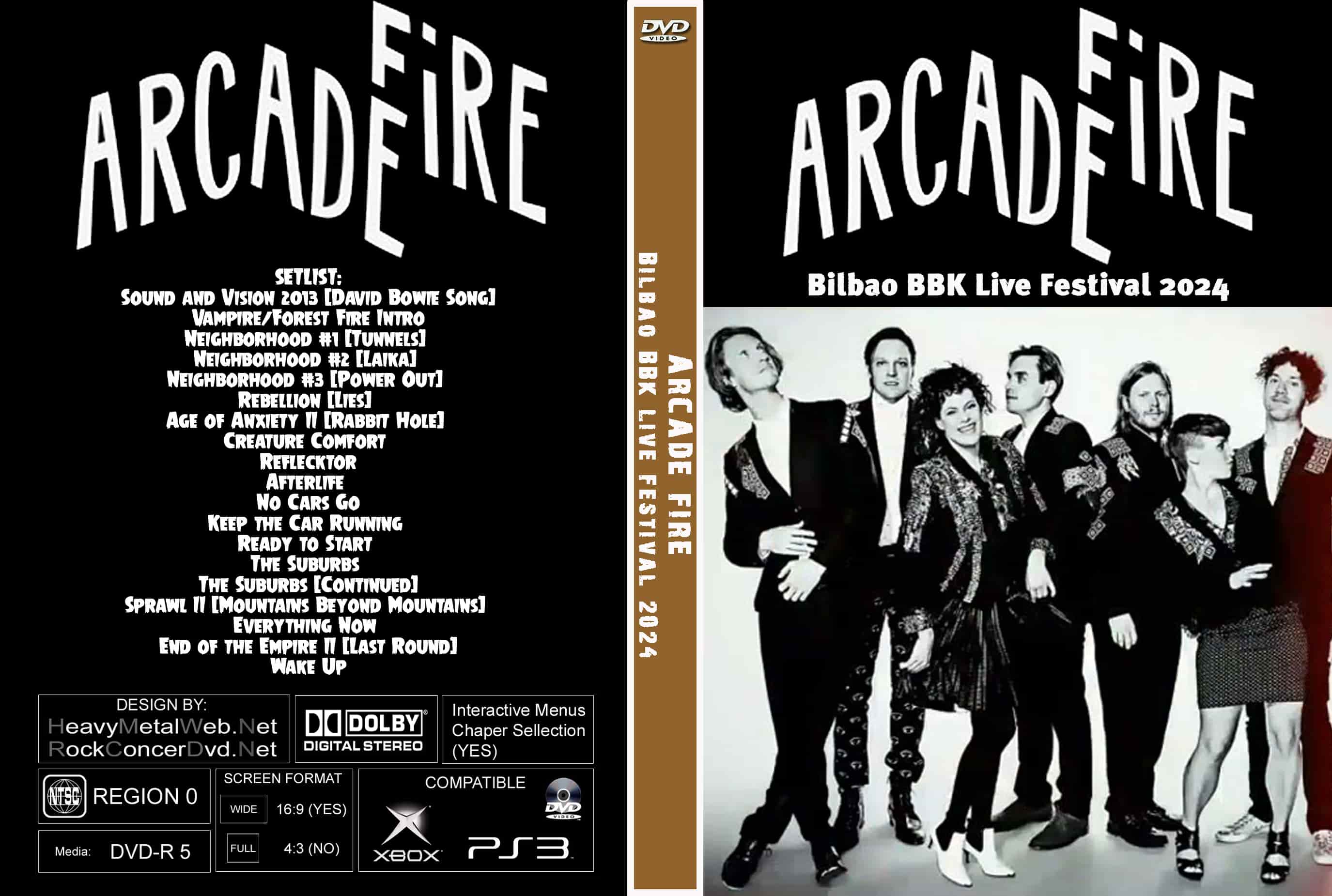 | ARCADE FIRE Bilbao BBK Live Festival 2024 DVD DVD Format: NTSC Source: Professional Shot (Multi- Camera) Video Quality: Rating: 9.0 Menus: Yes Chapter Selection: Every 5 Min. WideScreen: Yes HD: Yes Total Running Time: 92 Min. SETLIST: Sound and Vision 2013 (David Bowie Song) Vampire/Forest Fire Intro Neighborhood #1 (Tunnels) Neighborhood #2 (Laika) Neighborhood #3 (Power Out) Rebellion (Lies) Age of Anxiety II (Rabbit Hole) Creature Comfort Reflecktor Afterlife No Cars Go Keep the Car Running Ready to Start The Suburbs The Suburbs (Continued) Sprawl II (Mountains Beyond Mountains) Everything Now End of the Empire II (Last Round) Wake Up |