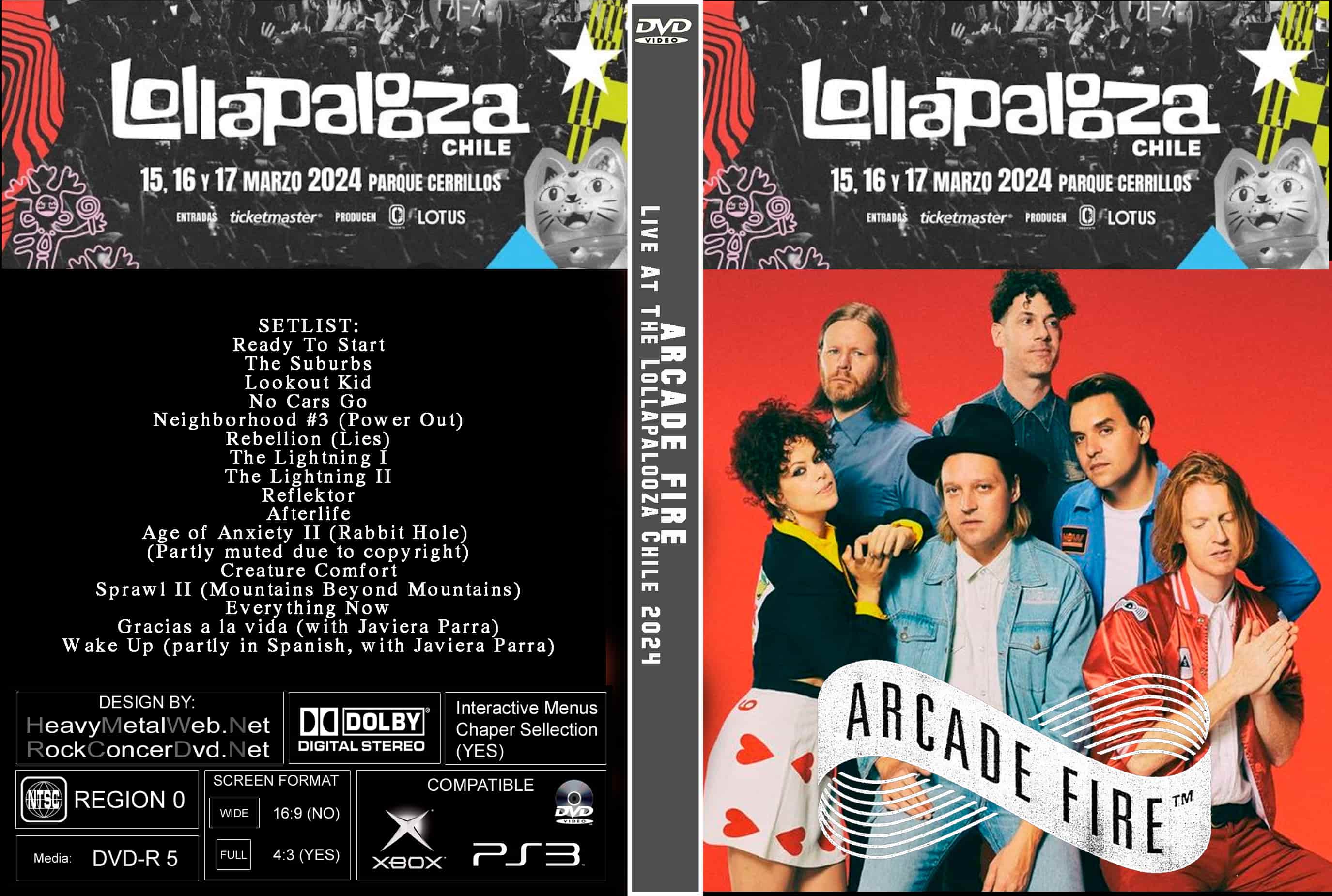 | ARCADE FIRE Live At The Lollapalooza Chile 2024 DVD DVD Format: NTSC Source: Professional Shot (Multi- Camera) Video Quality: Rating: 9.0 Menus: Yes Chapter Selection: Every 5 Min WideScreen: Yes HD: Yes Total Running Time: 91 Min. SETLIST: Ready To Start The Suburbs Lookout Kid No Cars Go Neighborhood #3 (Power Out) Rebellion (Lies) The Lightning I The Lightning II Reflektor Afterlife Age of Anxiety II (Rabbit Hole) (Partly muted due to copyright) Creature Comfort Sprawl II (Mountains Beyond Mountains) Everything Now Gracias a la vida (with Javiera Parra) Wake Up (partly in Spanish, with Javiera Parra) |