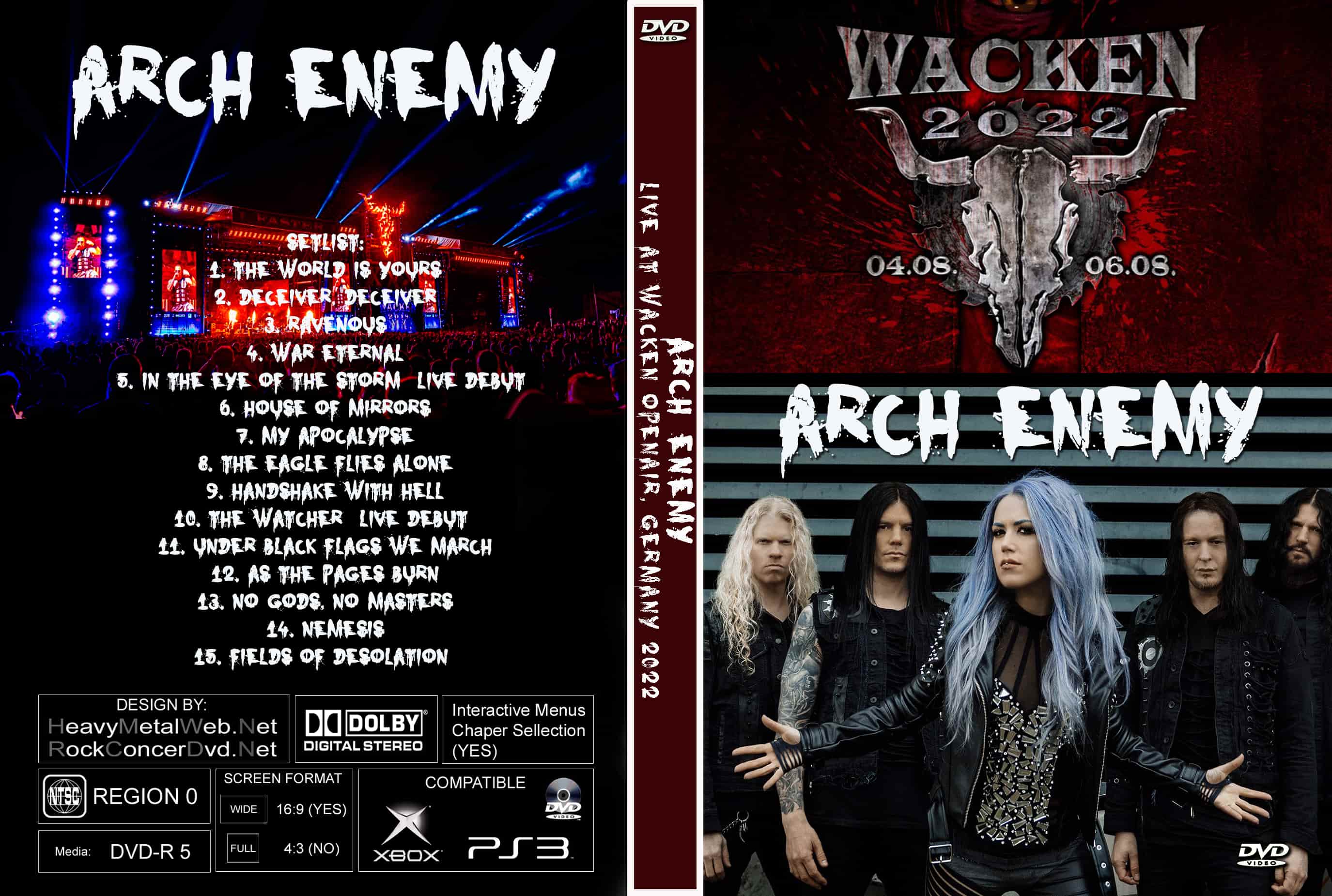 | ARCH ENEMY Live Wacken Open Air, Germany 2022 DVD DVD Format: NTSC Source: Professional Shot (Multi Camera) Video Quality: Rating: 9.0 Menus: No Chapter Selection: Every 5 Min Widescreen: Yes HD: Yes Total Running Time: 77 Min. SETLIST: 1. The World Is Yours 2. Deceiver, Deceiver 3. Ravenous 4. War Eternal 5. In the Eye of the Storm (live debut) 6. House of Mirrors 7. My Apocalypse 8. The Eagle Flies Alone 9. Handshake With Hell 10. The Watcher (live debut) 11. Under Black Flags We March 12. As the Pages Burn 13. No Gods, No Masters 14. Nemesis 15. Fields of Desolation (played as outro, not full song) |