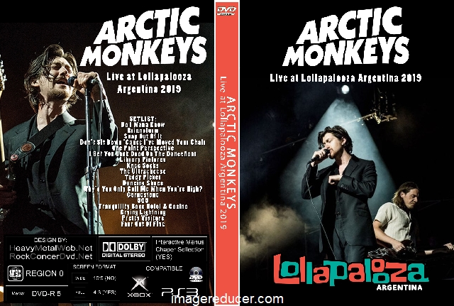 | ARCTIC MONKEYS Live at Lollapalooza Argentina 2019 DVD DVD Format: NTSC Source: Pro-Shot (Multi Camera) Video Quality: Rating: 9.0 Menus: Yes Chapter Selection: Every 5 Min. Widescreen: Yes HD: No Total Running Time: 79 Min. SETLIST: Do I Wana Know Brianstorm Snap Out Of It Don't Sit Down 'Cause I've Moved Your Chair One Point Perspective I Bet You Look Good On The Dancefloor Library Pictures Knee Socks The Ultracheese Teddy Picker Dancing Shoes Why'd You Only Call Me When You're High? Cornestone 505 Tranquility Base Hotel & Casino Crying Lightning Pretty Visitors Four Out Of Five |