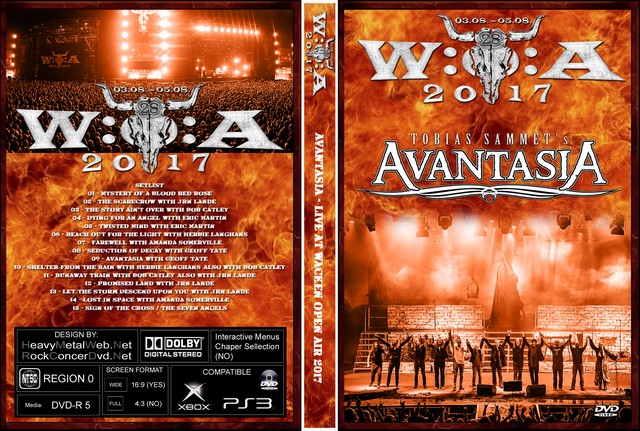 | AVANTASIA Live At Wacken Open Air 2017 DVD DVD Format: NTSC Source: Pro-Shot (Multi Camera) Video Quality: Rating: 9.0 Menus: Yes Chapter Selection: Yes Widescreen: Yes HD: Yes Total Running Time: 121 Min. SETLIST: 01 - Mystery of a Blood Red Rose 02 - The Scarecrow (with Jørn Lande) 03 - The Story Ain't Over (with Bob Catley) 04 - Dying for an Angel (with Eric Martin) 05 - Twisted Mind (with Eric Martin) 06 - Reach Out for the Light (with Herbie Langhans) 07 - Farewell (with Amanda Somerville) 08 - Seduction of Decay (with Geoff Tate) 09 - Avantasia (with Geoff Tate) 10 - Shelter from the Rain (with Herbie Langhans) (Also with Bob Catley) 11 - Runaway Train (with Bob Catley) (Also with Jørn Lande) 12 - Promised Land (with Jørn Lande) 13 - Let the Storm Descend Upon You (with Jørn Lande) 14 - Lost in Space (with Amanda Somerville) 15 - Sign of the Cross / The Seven Angels |