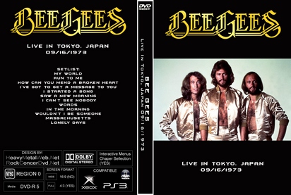 | BEE GEES Live In Tokyo, Japan 09/16/1973 DVD DVD Format: NTSC Source: Professional-Shot (Multi Camera) Video Quality: Rating: 7.0 (Low Quality) Menus: Yes Chapter Selection: Yes Widescreen: No HD: No Total Running Time: 47 Min. NOTE: This is a black & White footage, with Japanese subtitles, quality is low, but this is a very rare stuff of Bee Gees. SETLIST: My World Run To Me How Can You Mend A Broken Heart I've Got To Get A Message To You I Started A Song Saw A New Morning I Can't See Nobody Words In The Morning Wouldn't I Be Someone Massachusetts Lonely Days |
