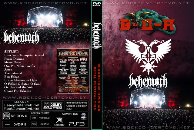 | BEHEMONTH Bloodstock Open Air Metal Festival 2016 DVD DVD Format: NTSC Source: Professional-Shot (Multi Camera) Video Quality: Rating: 8.0 (Webcast) Menus: No Chapter Sellection: Skip Every 5 Min. Widescreen: Yes HD: Yes Total Running Time: 60 Min. SETLIST: Blow Your Trumpets Gabriel Furor Divinus Messe Noire Ora Pro Nobis Lucifer Amen The Satanist Ben Sahar In the Absence ov Light O Father O Satan O Sun! Ov Fire and the Void Chant For Ezkaton |