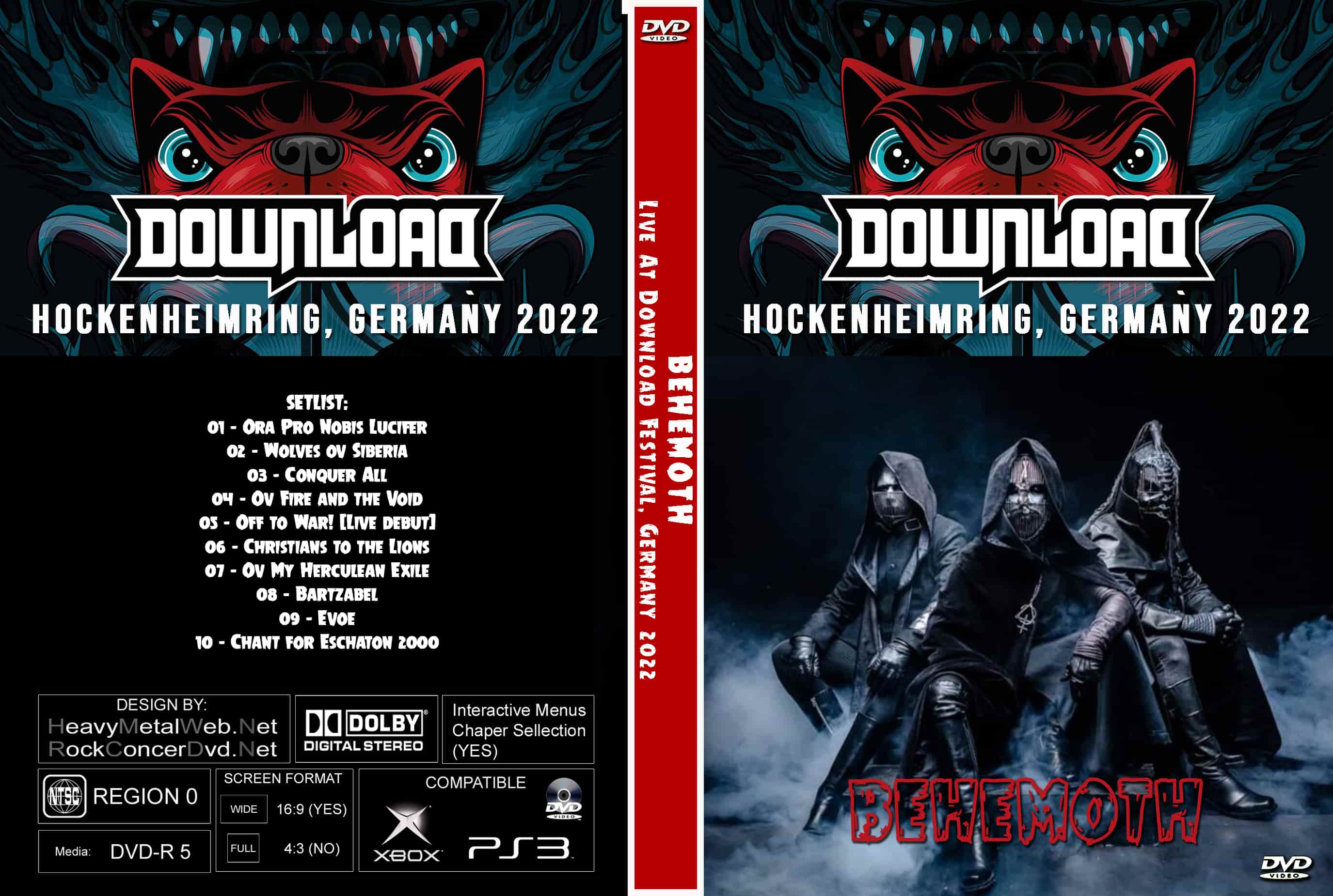 | BEHEMOTH Live At Download Festival, Germany 2022 DVD DVD Format: NTSC Source: Professional Shot (Multi Camera) Video Quality: Rating: 9.0 Menus: No Chapter Selection: Every 5 Min Widescreen: Yes HD: Yes Total Running Time: 50 Min. SETLIST: 01 - Ora Pro Nobis Lucifer 02 - Wolves ov Siberia 03 - Conquer All 04 - Ov Fire and the Void 05 - Off to War! (Live debut) 06 - Christians to the Lions 07 - Ov My Herculean Exile 08 - Bartzabel 09 - Evoe 10 - Chant for Eschaton 2000 |