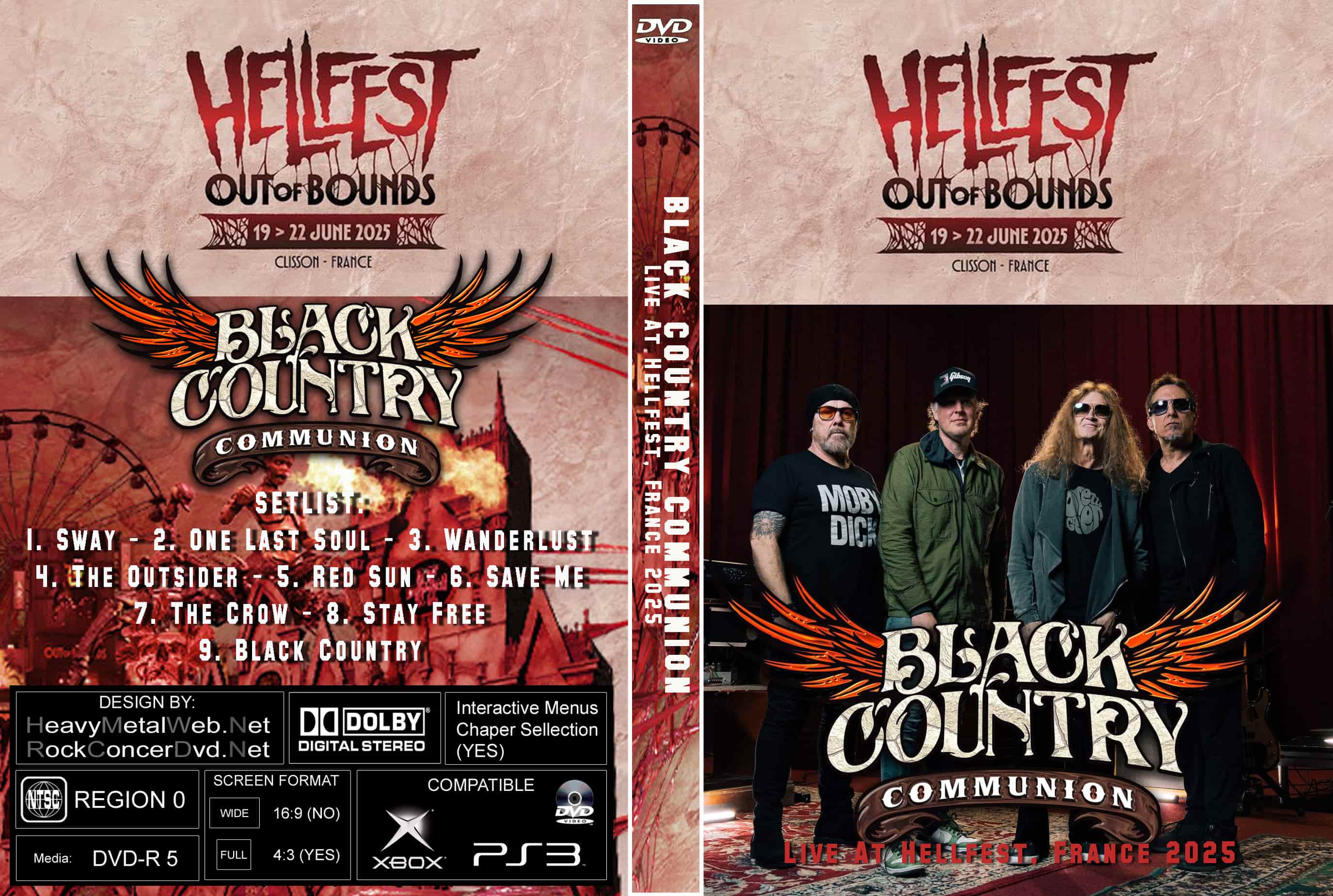 | BLACK COUNTRY COMMUNION Live At Hellfest, France 06-21-2025 DVD DVD Format: NTSC Source: Professional Shot Video Quality: Rating: 9.0, HD, Widescreen Menus: No Chapter Selection: Every 5 Min. Total Running Time: 58 Min SETLIST: 1. Sway 2. One Last Soul 3. Wanderlust 4. The Outsider 5. Red Sun 6. Save Me 7. The Crow 8. Stay Free 9. Black Country |