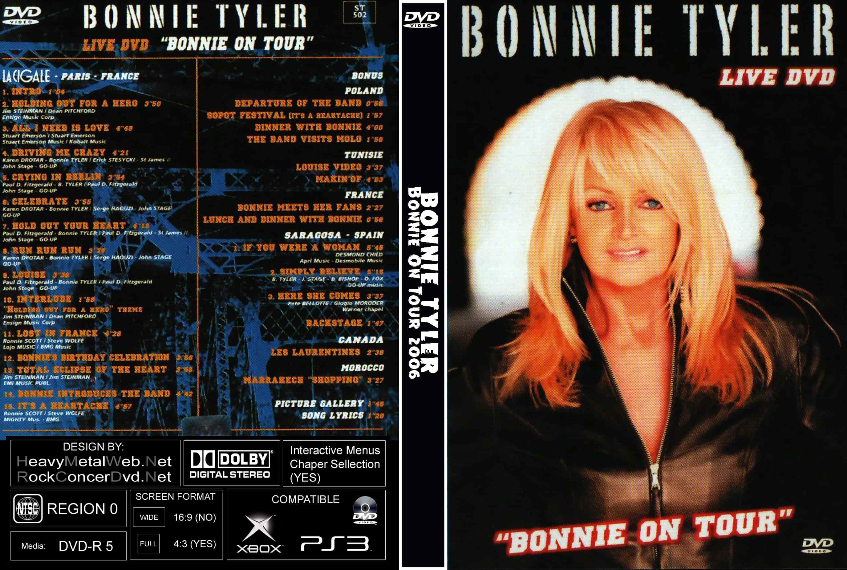 | BONNIE TYLER Bonnie On Tour 2006 DVD DVD Format: NTSC Source: Professional Shot (Multi- Camera) Video Quality: Rating: 9.0 Menus: Yes Chapter Selection: Yes WideScreen: Yes HD: Yes Total Running Time: 98 Min. 1 Intro La CigalE - PArizs FranciaorszAg 1:04 2 Holding Out for a Hero La Cigale - PArizs Franciaorszag 3:50 3 All I Need is Love La Cigale - Parizs Franciaorszag 4:47 4 Driving Me Crazy La Cigale - Parizs Franciaorszag 4:21 5 Crying in Berlin La Cigale - Parizs Franciaorszag 3:54 6 Celebrate La Cigale - Parizs Franciaorszag 3:55 7 Hold Out Your Heart La Cigale - Parizs Franciaorszag 4:15 8 Run, Run, Run La Cigale - Parizs Franciaorszag 3:28 9 Louise La Cigale - Parizs Franciaorszag 3:38 10 Interlude (Holding Out for a Hero Theme) La Cigale - Parizs Franciaorszag 1:58 11 Lost in France La Cigale - Parizs Franciaorszag 4:26 12 Bonnie’s Birthday Celebration La Cigale - Parizs Franciaorszag 2:56 13 Total Eclipse of the Heart La Cigale - Parizs Franciaorszag 3:59 14 Bonnie Introduces the Band La Cigale - Parizs Franciaorszag 4:42 15 It’s a Heartache La Cigale - Parizs Franciaorszag 5:00 BONUS: Poland 1 Departure of the Band Gdansk 0:58 2 Sopot Festival (It’s a Heartache) Sopot 1:57 3 Dinner with Bonnie Sopot 4:00 4 The Band Visits Molo 4:21 Tunisie 5 Louise Video 3:37 6 Makin’ Of 4:03 France 7 Bonnie Meets Her Fans 2:27 8 Lunch and Dinner with Bonnie 0:56 Saragosa - Spain 9 If You Were A Woman 5:45 10 Simply Believe 5:15 11 Here She Comes 3:37 12 Backstage 1:47 Canada 13 Les Laurentines Canada 2:39 Marocco 14 Shopping Marrakech Marocco 3:27 15 Picture Gallery - 1:45 16 Song Lyrics - 1:20 |