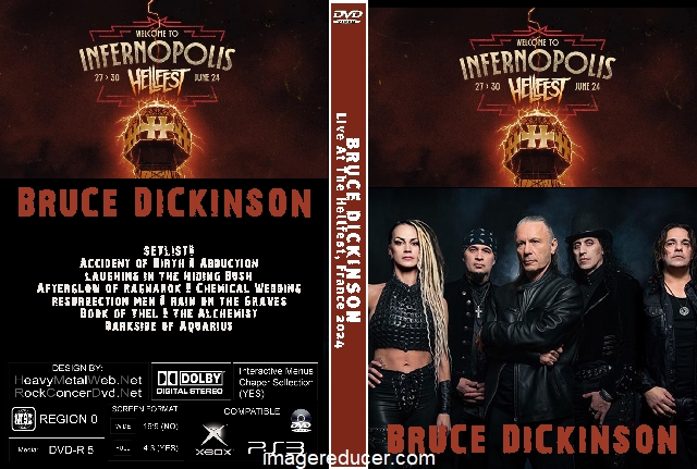 | BRUCE DICKINSON Live At The Hellfest, France 2024 DVD DVD Format: NTSC Source: Professional Shot (Multi- Camera) Video Quality: Rating: 9.0 Menus: Yes Chapter Selection: Every 5 Min. WideScreen: Yes HD: Yes Total Running Time: 59 Min. SETLIST: Accident of Birth Abduction Laughing in the Hiding Bush Afterglow of Ragnarok Chemical Wedding Resurrection Men Rain on the Graves Book of Thel The Alchemist Darkside of Aquarius |