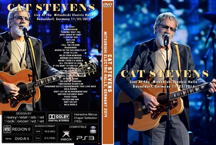 | CAT STEVENS Live At The Mitsubishi Electric Halle, Dusseldorf, Germany 11/25/2014 DVD DVD Format: NTSC Source: Audience Shot (Single Camera) Video Quality: Rating: 8.5 Menus: Yes Chapter Selection: Yes Widescreen: Yes HD: No Total Running Time: 116 Min. SETLIST: Moonshadow Thinking 'Bout You Here Comes My Baby I Love My Dog Sad Lisa Sitting Tell 'Em I'm Gone Roadsinger Where Do The Children Play? Dying To Live Miles From Nowhere Morning Has Broken Maybe There's A World All You Need Is Love If You Want To Sing Out, Sing Out Big Boss Man Editing Floor Blues The First Cut Is The Deepest The Devil Came From Kansas Oh Very Young You Are My Sunshine I Was Raised In Babylon Foreigner Suite / Heaven/Where True Love Goes Gold Digger Don't Let Me Be Misunderstood Another Saturday Night Peace Train Father And Son Don't Be Shy Wild World |