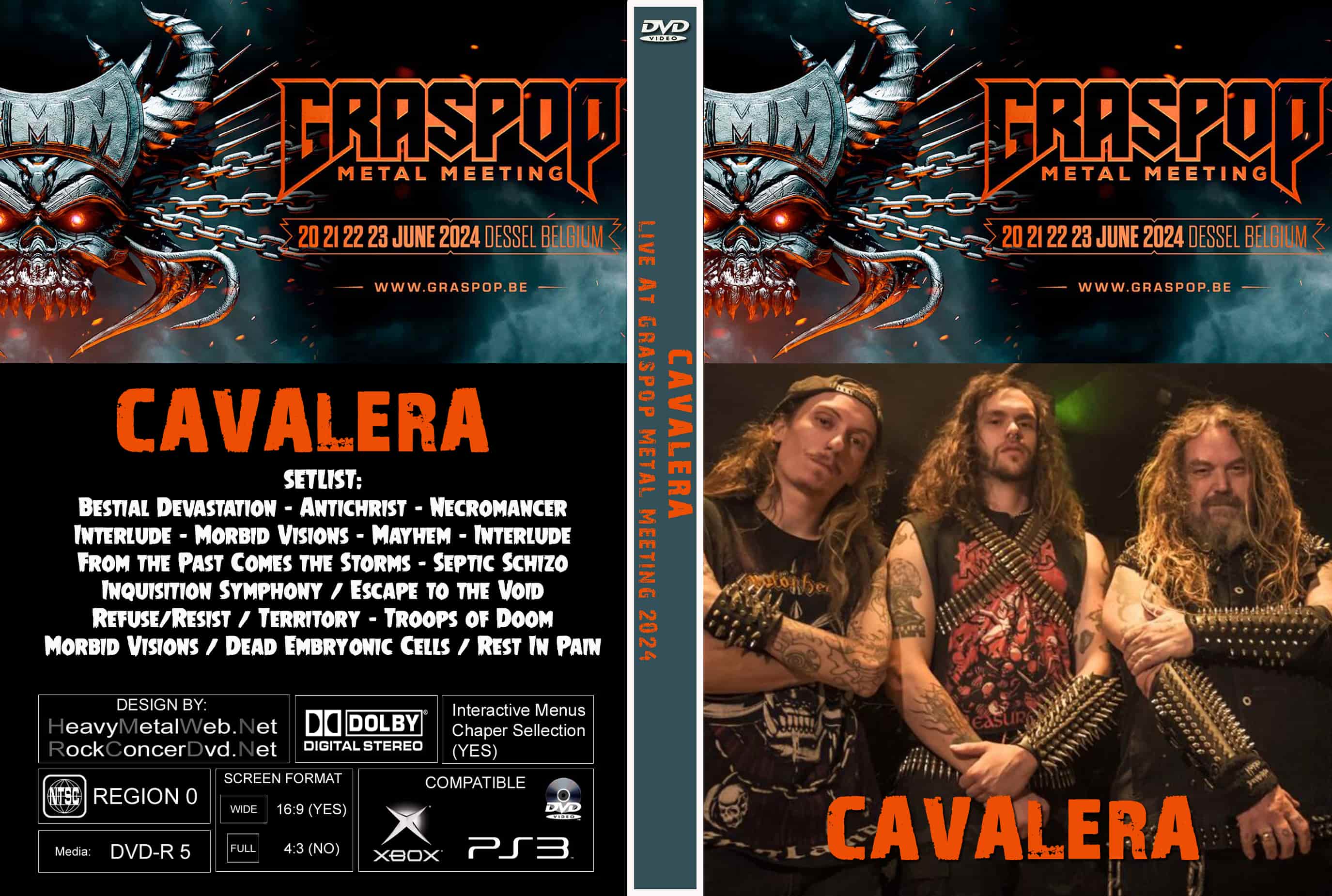 | CAVALERA Live At Graspop Metal Meeting 2024 DVD DVD Format: NTSC Source: Professional Shot (Multi- Camera) Video Quality: Rating: 8.5 Menus: Yes Chapter Selection: Every 5 Min. WideScreen: Yes HD: Yes Total Running Time: 57 Min. SETLIST: Bestial Devastation Antichrist Necromancer Interlude Morbid Visions Mayhem Interlude From the Past Comes the Storms Septic Schizo Inquisition Symphony / Escape to the Void Refuse/Resist / Territory Troops of Doom Morbid Visions / Dead Embryonic Cells / Rest In Pain |