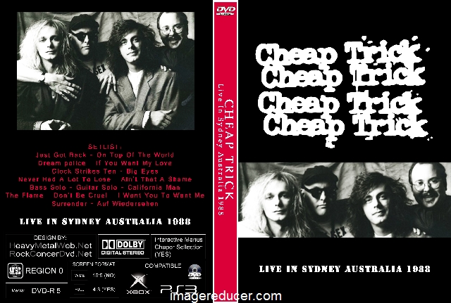 | CHEAP TRICK Live In Sydney Australia 1988 DVD DVD Format: NTSC Source: Pro-Shot (Multi Camera) Video Quality: Rating: 8.5 Menus: Yes Chapter Selection: Every 5 Min. Full Screen: Yes HD: No Total Running Time: 68 Min. SETLIST: Just Got Back On Top Of The World Dream police If You Want My Love Clock Strikes Ten Big Eyes Never Had A Lot To Lose Ain't That A Shame Bass Solo Guitar Solo California Man The Flame Don't Be Cruel I Want You To Want Me Surrender Auf Wiedersehen |
