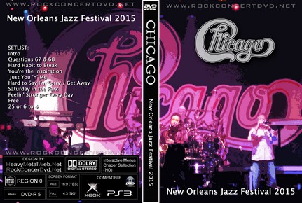 | CHICAGO New Orleans Jazz Festival 2015 DVD DVD Format: NTSC Source: Professional Shot (Multi Camera) Video Quality: Rating: 9.0 Menus: No Chapter Selection: Skip Every 5 Min. Widescreen: Yes HD: Yes Total Running Time: 52 Min. SETLIST: Intro Questions 67 & 68 Hard Habit to Break You're the Inspiration Just You 'n' Me Hard to Say I'm Sorry / Get Away Saturday in the Park Feelin' Stronger Every Day Free 25 or 6 to 4 |