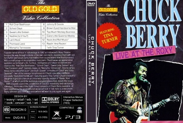 | CHUCK BERRY Live At The Roxy 1982 DVD DVD Format: NTSC Source: Pro-Shot (Multi Camera) Video Quality: Rating: 7.8 Menus: No Chapter Selection: Every 5 Min Widescreen: No HD: No Total Running Time: 60 Min. SETLIST: Roll over Beethoven School days Sweet little sixteen Nadine Let it rock Promised land Memphis, Tennessee Johnny B. Goode Brown eyed handsome man Too much monkey business Carol Little queenie Rock and Roll music (with Tina Turner) Instrumental Reelin' and Rockin' (with Ingrid Berry) |