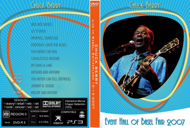 | CHUCK BERRY Live In Basel, Switzerland 10-13-2007 DVD DVD Format: NTSC Source: Pro-Shot (Multi Camera) Video Quality: Rating: 9.0 Menus: Yes Chapter Selection: Yes Widescreen: Yes HD: Yes Total Running Time: 51 Min. TRACKLIST: 01) Wee Wee Hours 02) Let It Rock 03) Memphis, Tennessee 04) Everyday I Have The Blues 05) You Never Can Tell 06) Carol/Little Queenie 07) My Ding-A-Ling 08) Around And Around 09) You Never Can tell (Reprise) 10) Johnny B. Goode 11) Reelin’ And Rockin’ |