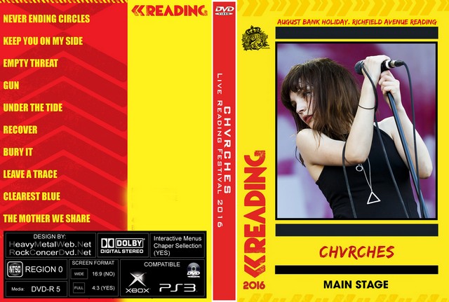 | CHVRCHES Live Reading Festival 2016 DVD DVD Format: NTSC Source: Professional-Shot (Multi Camera) Video Quality: Rating: 9.0 Menus: No Chapter Sellection: Skip Every 5 Min. Widescreen: Yes Total Running Time: 45 Min. Setlist: 01. Never Ending Circles 02. Keep You on My Side 03. Empty Threat 04. Gun 05. Under the Tide 06. Recover 07. Bury It 08. Leave a Trace 09. Clearest Blue 10. The Mother We Share |