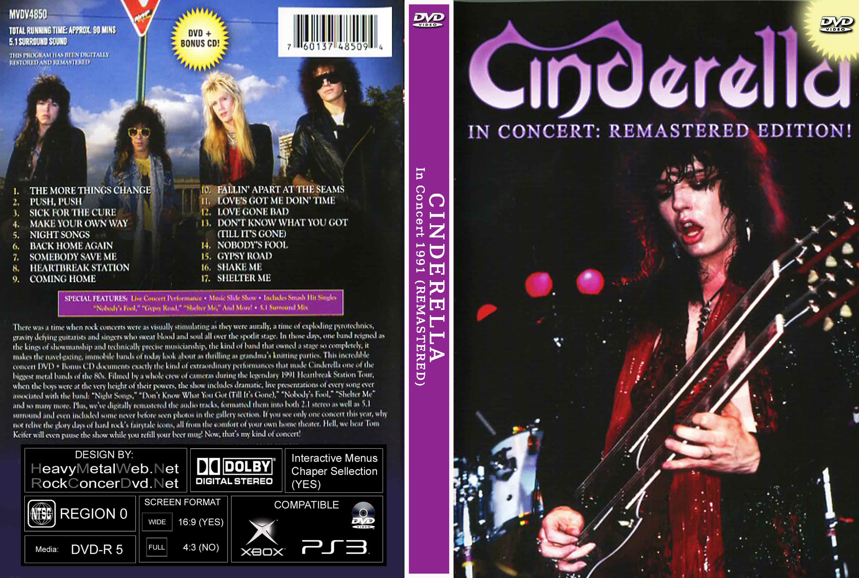 | CINDERELLA In Concert 1991 + Live At Litle Rock, AR 05-21-1991 (REMASTERED) (1 DVD + 1 AUDIO DVD) DVD Format: NTSC Source: Professional Shot (Multi Camera) Video Quality: Rating: 9.0 Menus: No Chapter Selection: Every 5 Min Widescreen: Yes HD: Yes Total Running Time: 82 Min. DVD 1 In Concert 1991 (REMASTERED) 01. The More Things Change 02. Push Push 03. Sick For The Cure 04. Make Your Own Way 05. Night Songs 06. Back Home Again 07. Somebody Save Me 08. Heartbreak Station 09. Coming Home 10. Fallin Apart At The Seams 11. Love's Got Me Doin' Time 12. Drum Solo 13. Instumental 14. Don't Know What You Got (Till It's Gone) 15. Nobody's Fool 16. Gypsy Road 17. Shake Me 18. Shelter Me DVD 2 Live At Barton Coliseum, Litle Rock, AR 05-21-1991 (Audio DVD: FM Broadcast FLAC) 01. Sick For The Cure 02. Make Your Own Way 03. The More Things Change 04. Gypsy Road 05. Long Cold Winter > Fallin' Apart At The Seams 06. Heartbreak Station 07. Night Songs 08. Nobody's Fool 09. Coming Home 10. Push Push 11. Shake Me |