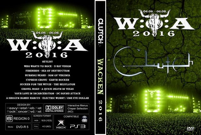 | CLUTCH Live At Wacken Open Air 2016 DVD DVD Format: NTSC Source: Pro-Shot (Multi Camera) Video Quality: Rating: 9.0 Menus: No Chapter Selection: Every 5 Min. Widescreen: Yes HD: Yes Total Running Time: 68 Min. SETLIST: Who Wants to Rock X-Ray Vision Firebirds Sea of Destruction Burning Beard Son of Virginia Cypress Grove Earth Rocker Sucker for the Witch The Regulator Gravel Road A Quick Death in Texas Your Love in Incarceration DC Sound Attack A Shogun Named Marcus Electric Worry / One Eye Dollar |