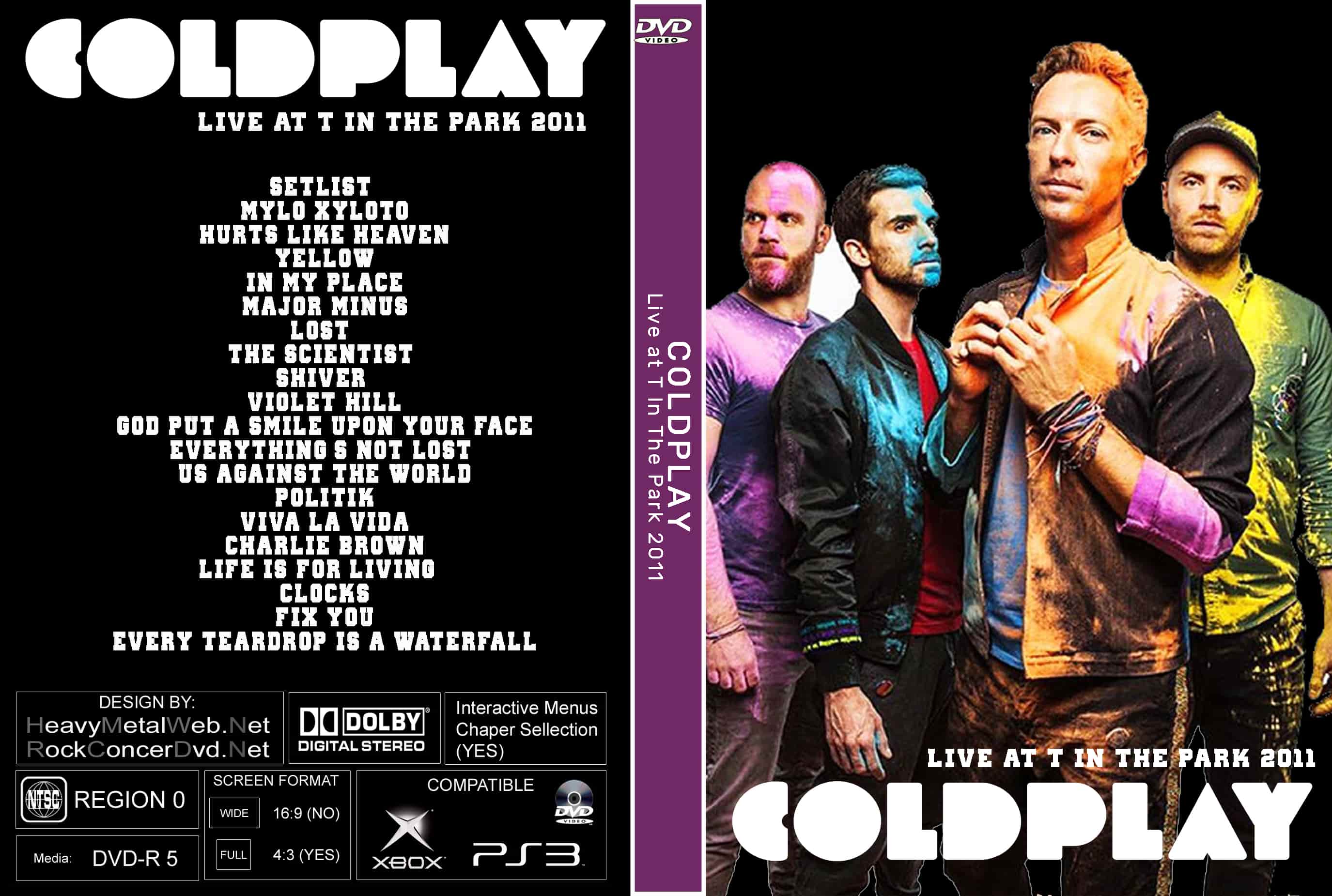 | COLDPLAY Live at T In The Park 2011 DVD DVD Format: NTSC Source: Professional Shot (Multi Camera) Video Quality: Rating: 9.0 Menus: No Chapter Selection: Every 5 Min Widescreen: Yes HD: Yes Total Running Time: 90 Min. SETLIST: Mylo Xyloto Hurts Like Heaven Yellow In My Place Major Minus Lost! The Scientist Shiver Violet Hill God Put A Smile Upon Your Face Everything's Not Lost Us Against The World Politik Viva la Vida Charlie Brown Life is for Living Clocks Fix You Every Teardrop is A Waterfall |