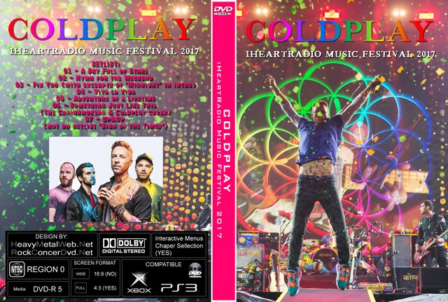 | COLDPLAY iHeartRadio Music Festival 2017 DVD DVD Format: NTSC Source: Pro-Shot (Multi Camera) Video Quality: Rating: 9.0 Menus: No Chapter Selection: Every 5 Min Widescreen: Yes HD: Yes Total Running Time: 37 Min. SETLIST: 01 - A Sky Full of Stars 02 - Hymn for the Weekend 03 - Fix You (with excerpts of "Midnight" in intro) 04 - Viva la Vida 05 - Adventure of a Lifetime 06 - Something Just Like This (The Chainsmokers & Coldplay cover) 07 - Up&Up (not on setlist; with excerpt of Harry Styles' "Sign of the Times") |