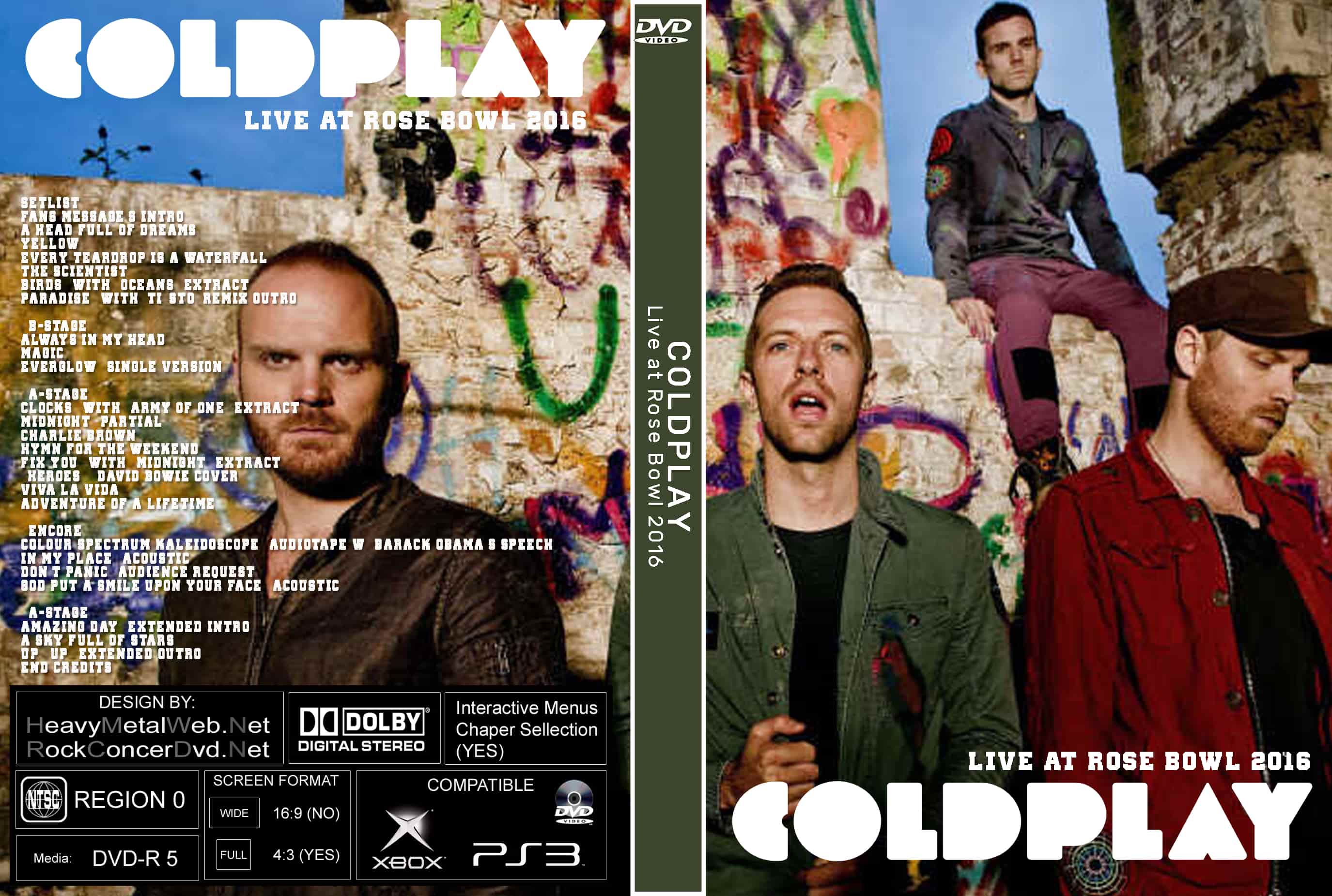| COLDPLAY Live at Rose Bowl 2016 (2 DVDs) DVD Format: NTSC Source: Professional Shot (Multi Camera) Video Quality: Rating: 8.5 Menus: No Chapter Selection: Every 5 Min Widescreen: Yes HD: Yes Total Running Time: 120 Min. SETLIST: Fans Message's Intro A Head Full of Dreams Yellow Every Teardrop Is a Waterfall The Scientist Birds (with "Oceans" extract) Paradise (with 'Tiësto' remix outro) –B-Stage– Always in My Head Magic Everglow (Single Version) –A-Stage– Clocks (with "Army of One" extract) Midnight (partial) Charlie Brown Hymn for the Weekend Fix You (with "Midnight" extract) “Heroes” (David Bowie cover) Viva la Vida Adventure of a Lifetime –Encore– Colour Spectrum/Kaleidoscope (Audiotape w/ Barack Obama's speech) In My Place (acoustic) Don't Panic (audience request) God Put a Smile Upon Your Face (acoustic) –A-Stage– Amazing Day (extended intro) A Sky Full of Stars Up&Up (extended outro) End Credits |