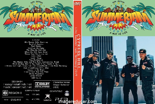 | CYPRESS HILL Live Summer Jam, Germany 2019 DVD DVD Format: NTSC Source: Pro-Shot (Multi Camera) Video Quality: Rating: 9.0 Menus: No Chapter Selection: Every 5 Min Widescreen: Yes HD: Yes Total Running Time: 65 Min. SETLIST: Mix Master Mike Warm-up Band of Gypsies Real Estate Hand on the Pump The Phuncky Feel One When the Shit Goes Down Throw Your Set in the Air Lick a Shot Latin Thugs Tequila Sunrise Mix Master Mike and Eric Bobo Instrumental Break Weed Medley (Roll It Up, Light It Up, Smoke It Up / I Wanna Get High / Cisco Kid / Dr. Greenthumb / Hits from the Bong) How I Could Just Kill a Man Insane in the Brain I Ain’t Goin’ Out Like That (Rock) Superstar Jump Around LSD-Outro |