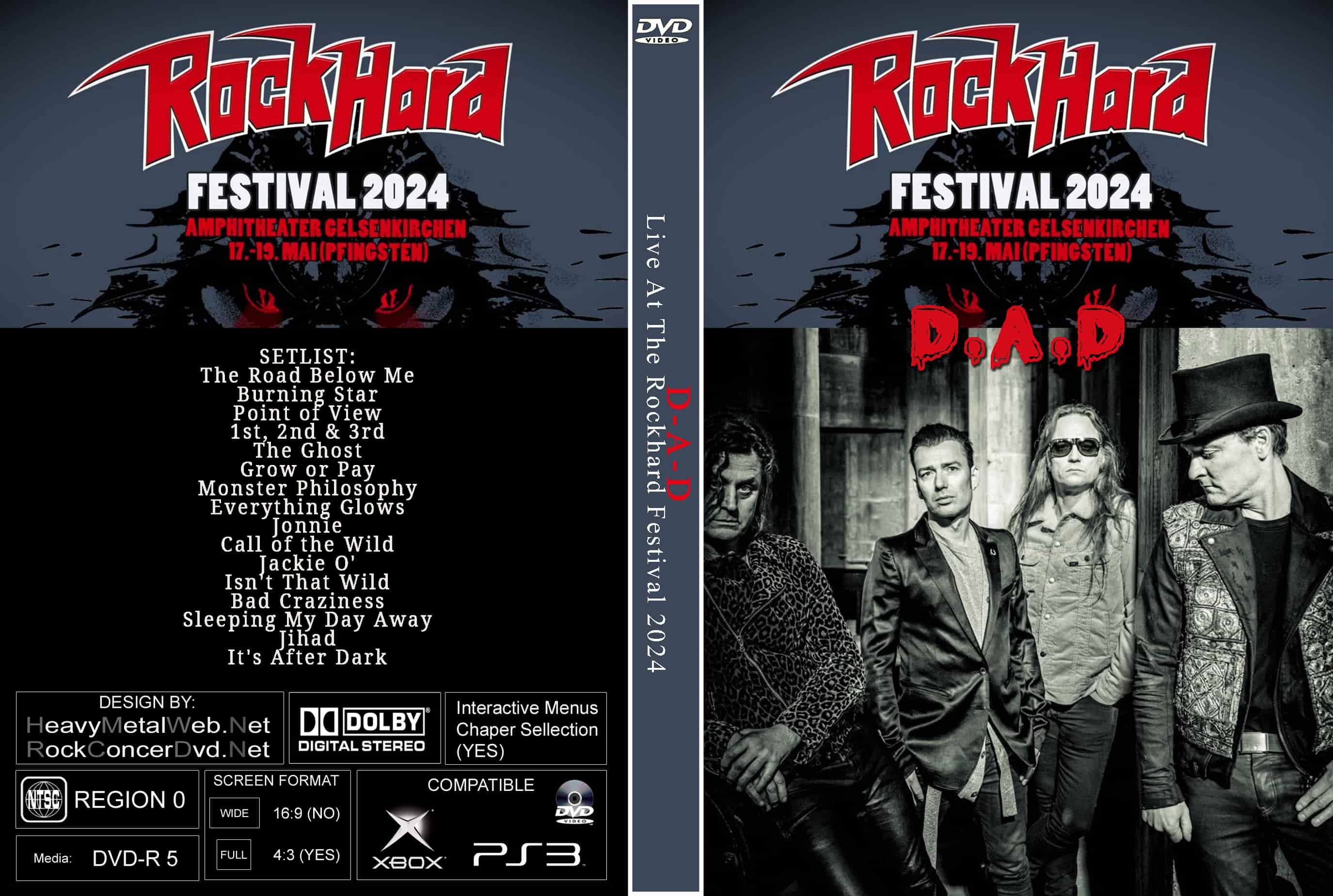 | D-A-D Live At The Rock Hard Festival 2024 DVD DVD Format: NTSC Source: Professional Shot (Multi- Camera) Video Quality: Rating: 9.0 Menus: Yes Chapter Selection: Every 5 Min. WideScreen: Yes HD: Yes Total Running Time: 80 Min. SETLIST: The Road Below Me Burning Star Point of View 1st, 2nd & 3rd The Ghost Grow or Pay Monster Philosophy Everything Glows Jonnie Call of the Wild Jackie O' Isn't That Wild Bad Craziness Sleeping My Day Away Jihad It's After Dark |