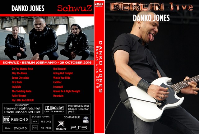 | DANKO JONES Berlin Live 2016 DVD DVD Format: NTSC Source: Pro-Shot (Multi Camera) Video Quality: Rating: 9.0 Menus: Yes Chapter Selection: Yes Widescreen: Yes HD: Yes Total Running Time: 59 Min. SETLIST: Do You Wanna Rock Play the Blues Sugar Chocolate First Date Invisible The Twisting Knife Full of Regret My Little Rock N Roll Had Enough Going Out Tonight Watch You Slide Cadillac Lovercall Gonna Be A Fight Tonight Mountain |
