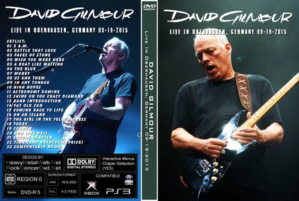 | DAVID GILMOUR Live In Oberhausen, Germany 09/19/2015 (2 DVDs) DVD Format: NTSC Source: Audience Shot (Single Camera) Video Quality: Rating: 8.5 Menus: Yes Chapter Selection: Yes Widescreen: Yes HD: No Total Running Time: 157 Min. SETLIST: 01 5 A.M. 02 Rattle That Lock 03 Faces Of Stone 04 Wish You Were Here 05 A Boat Lies Waiting 06 The Blue 07 Money 08 Us And Them 09 In Any Tongue 10 High Hopes 11 Astronomy Domine 12 Shine On You Crazy Diamond 13 Band Introduction 14 Fat Old Sun 15 Coming Back To Life 16 On An Island 17 The Girl In The Yellow Dress 18 Today 19 Sorrow 20 Run Like Hell 21 Encore Chatter 22 Time (and Breathe Reprise) 23 Comfortably Numb |