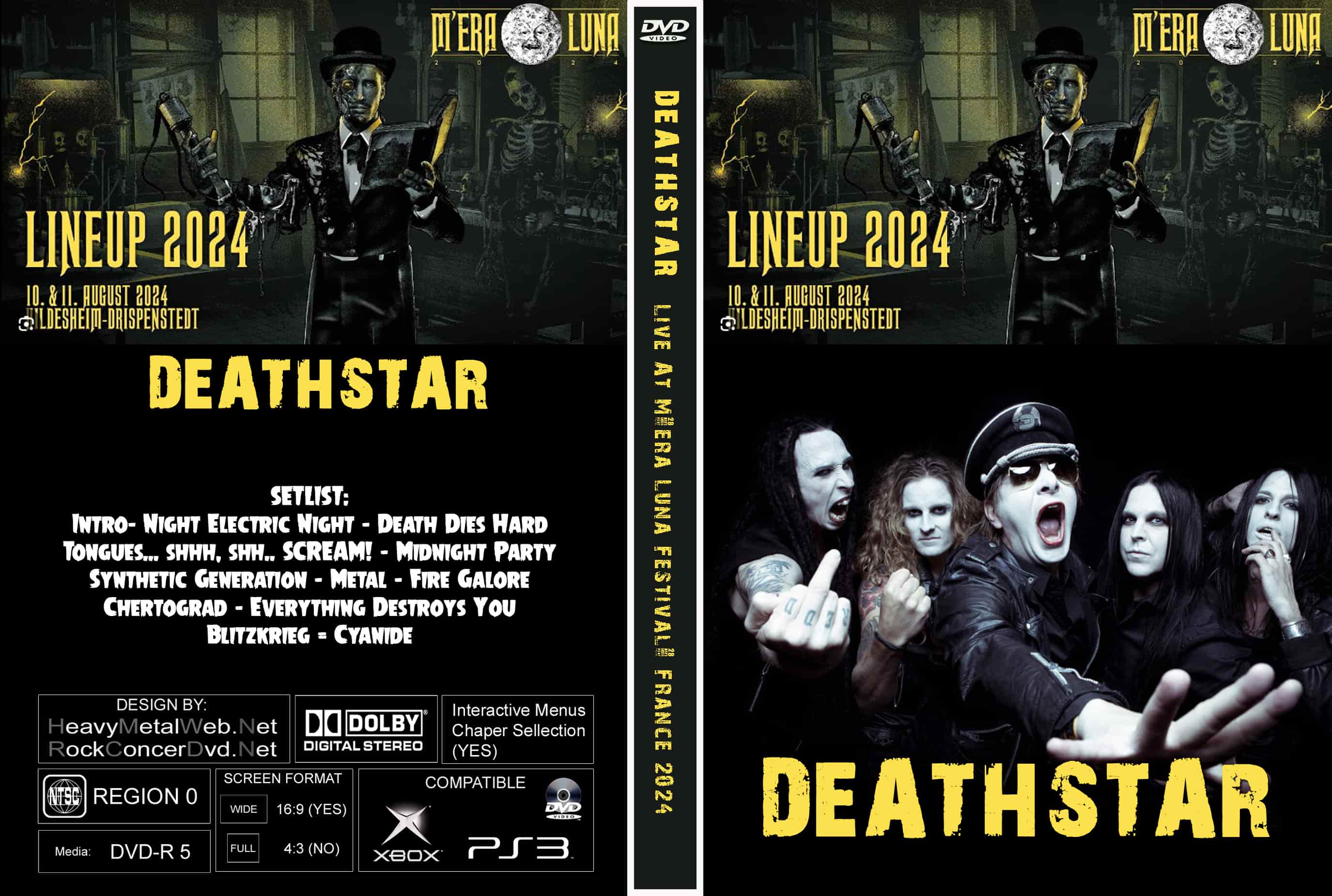 | DEATHSTAR Live At M'era Luna Festival, France 2024 DVD DVD Format: NTSC Source: Professional Shot (Multi- Camera) Video Quality: Rating: 9.0 Menus: Yes Chapter Selection: Every 5 Min. WideScreen: Yes HD: Yes Total Running Time: 45 Min. SETLIST: Intro Night Electric Night Death Dies Hard Tongues... shhh, shh.. SCREAM! Midnight Party Synthetic Generation Metal Fire Galore Chertograd Everything Destroys You Blitzkrieg Cyanide |