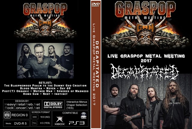 | DECAPITATED Live at Graspop Metal Meeting 2017 DVD DVD Format: NTSC Source: Pro-Shot (Multi Camera) Video Quality: Rating: 8.0 Menus: Yes Chapter Selection: Yes Widescreen: Yes HD: Yes Total Running Time: 54 Min. SETLIST: The Blasphemous Psalm to the Dummy God Creation Blood Mantra Never Day 69 Post(?) Organic Mother War Spheres of Madness Homo Sum Nest Instinct |