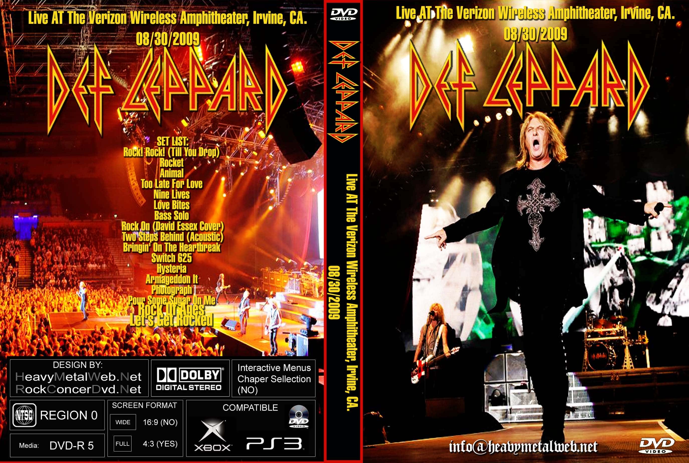 DEF LEPPARD Live Verizon Wireless Amphitheater, Irvine, CA. 08/30/2009 (2 DVDs) DVD Format: NTSC Source: Audience-Shot: (Single-Camera) Video Quality: Rating: 8.5 Menus: No Chapter Selection: No Total Running Time: 90 Min. SET LIST: Rock! Rock! (Till You Drop) Rocket Animal Too Late For Love Nine Lives Love Bites Bass Solo Rock On (David Essex Cover) Two Steps Behind (Acoustic) Bringin' On The Heartbreak Switch 625 Hysteria Armageddon It Photograph Pour Some Sugar On Me Rock Of Ages Let's Get Rocked |