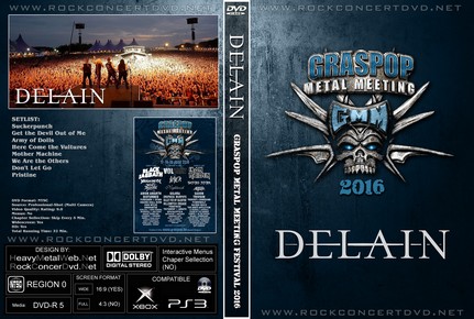 | DELAIN Live Graspop Metal Meeting Festival 2016 DVD DVD Format: NTSC Source: Professional-Shot (Multi Camera) Video Quality: Rating: 9.0 Menus: No Chapter Sellection: Skip Every 5 Min. Widescreen: Yes HD: Yes Total Running Time: 32 Min. SETLIST: Suckerpunch Get the Devil Out of Me Army of Dolls Here Come the Vultures Mother Machine We Are the Others Don't Let Go Pristine |