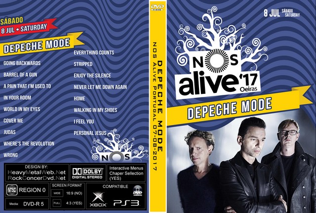 | DEPECHE MODE NOS Alive Portugal 07-08-2017 DVD DVD Format: NTSC Source: Pro-Shot (Multi Camera) Video Quality: Rating: 9.0 Menus: Yes Chapter Selection: Yes Widescreen: Yes HD: Yes Total Running Time: 111 Min. SETLIST: Revolution (taped) Cover Me (remix) (taped) Going Backwards Barrel of a Gun A Pain That I’m Used To In Your Room World in My Eyes Cover Me Judas Happy Birthday Where’s the Revolution Wrong Everything Counts Stripped Enjoy the Silence Never Let Me Down Again Home Walking in My Shoes I Feel You Personal Jesus |