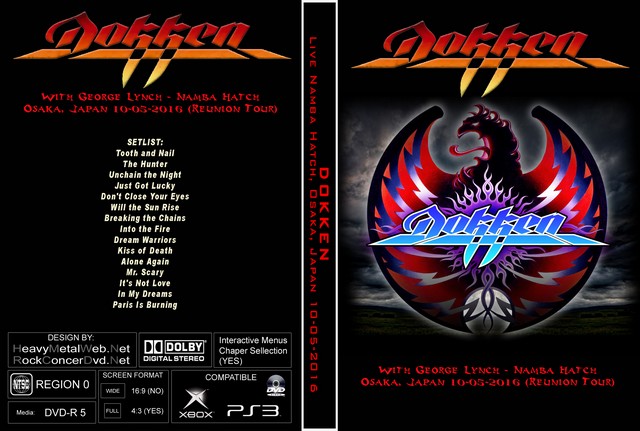 | DOKKEN With George Lynch - Namba Hatch, Osaka, Japan 10/05/2016 (Reunion Tour) DVD DVD Format: NTSC Source: Audience Shot (Single Camera) Video Quality: Rating: 7.8 Menus: No Chapter Selection: Every 5 Min. Widescreen: Yes HD: Yes Total Running Time: 40 Min. SETLIST: Tooth and Nail The Hunter Unchain the Night Just Got Lucky Don't Close Your Eyes Will the Sun Rise Breaking the Chains Into the Fire Dream Warriors Kiss of Death Alone Again Mr. Scary It's Not Love In My Dreams Paris Is Burning |