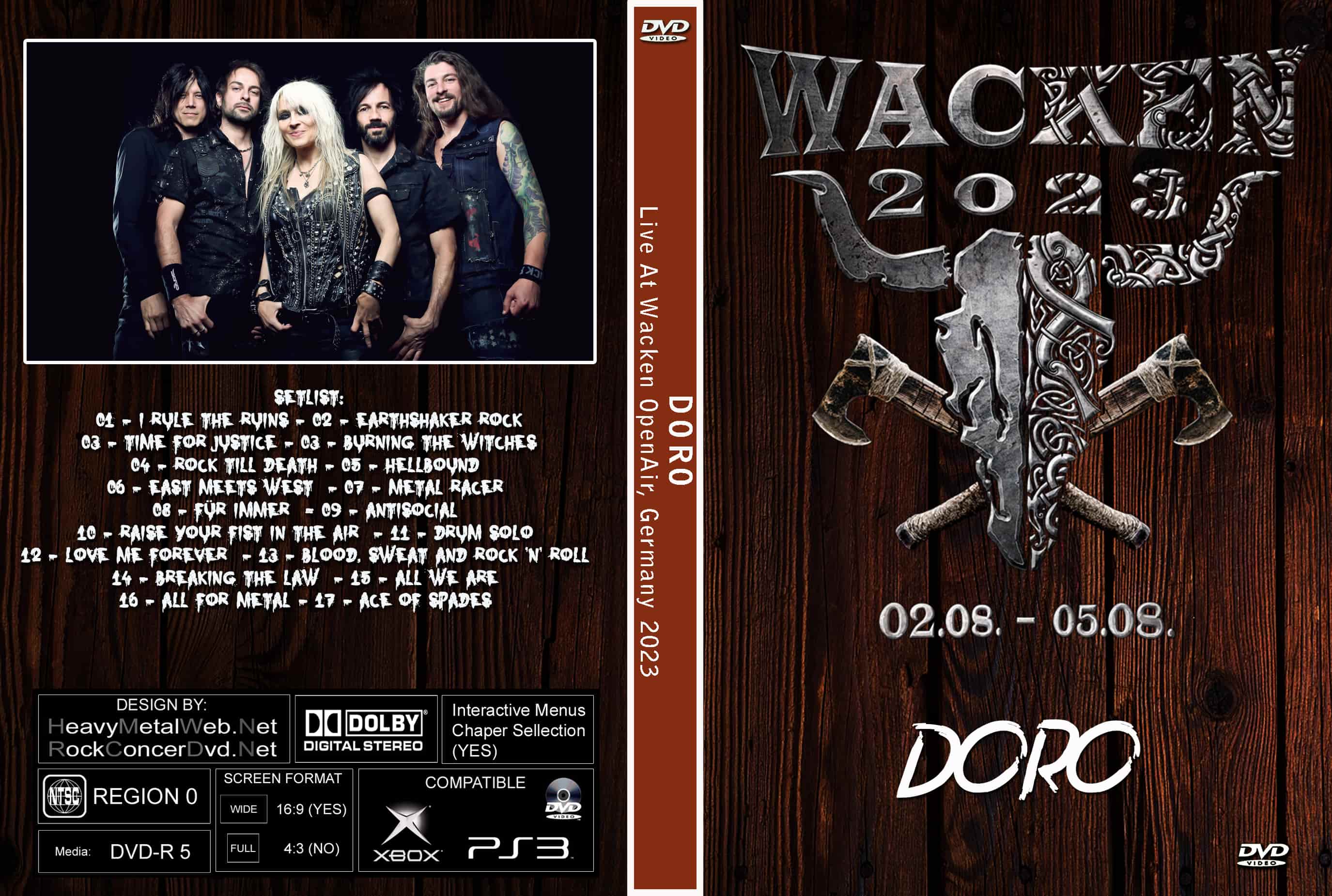| DORO Live At The Wacken Open Air 2023 (2 DVDs) DVD Format: NTSC Source: Professional Shot (Multi- Camera) Video Quality: Rating: 9.0 Menus: Yes Chapter Selection: Yes WideScreen: Yes HD: Yes Total Running Time: 123 Min. SETLIST: 01 - I Rule the Ruins (Warlock cover) 02 - Earthshaker Rock (Warlock cover) 03 - Time for Justice 03 - Burning the Witches (Warlock cover) 04 - Rock Till Death (with Hansi Kürsch) 05 - Hellbound (Warlock cover) 06 - East Meets West (Warlock cover) (with Sammy Amara) 07 - Metal Racer (Warlock cover) 08 - Für immer (Warlock cover) 09 - Antisocial (Trust cover) (with Joey Belladonna) 10 - Raise Your Fist in the Air (with Joey Belladonna) 11 - Drum Solo (Johnny Dee) 12 - Love Me Forever (Motörhead cover) (with Mikkey Dee) (With Phil Campbell) 13 - Blood, Sweat and Rock ’n’ Roll (with Michael Rhein) 14 - Breaking the Law (Judas Priest cover) (with Uli Jon Roth) (With Udo Dirkschneider) 15 - All We Are (Warlock cover) (with Uli Jon Roth) (With Joey Belladonna, Udo Dirkschneider, Hansi Kürsch, Sammy Amara and Michael Rhein on stage) Encore: 16 - All for Metal 17 - Ace of Spades (Motörhead cover) (with Mikkey Dee) (with Phil Campell) |