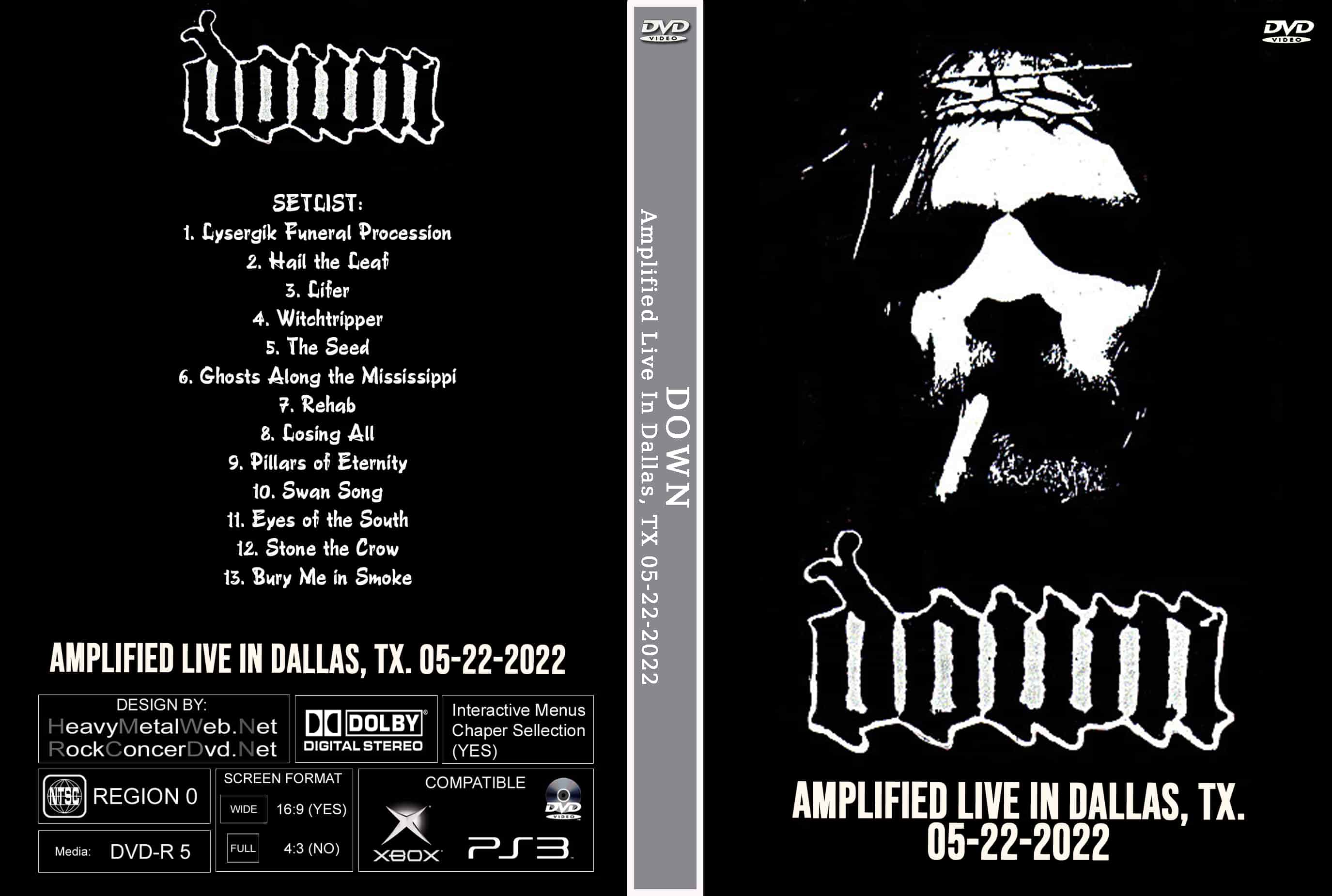 | DOWN Amplified Live In Dallas, TX 05-22-2022 DVD DVD Format: NTSC Source: Professional Shot (Multi- Camera) Video Quality: Rating: 9.0 Menus: No Chapter Selection: Skip Avery 5 Min WideScreen: Yes HD: Yes Total Running Time: 80 Min. SETLIST: 1. Lysergik Funeral Procession 2. Hail the Leaf 3. Lifer 4. Witchtripper 5. The Seed 6. Ghosts Along the Mississippi 7. Rehab 8. Losing All 9. Pillars of Eternity 10. Swan Song 11. Eyes of the South 12. Stone the Crow 13. Bury Me in Smoke |